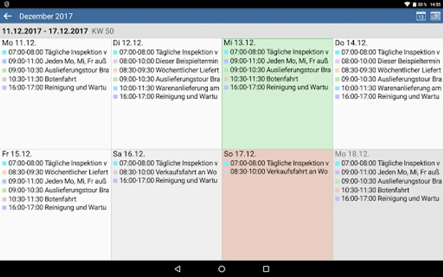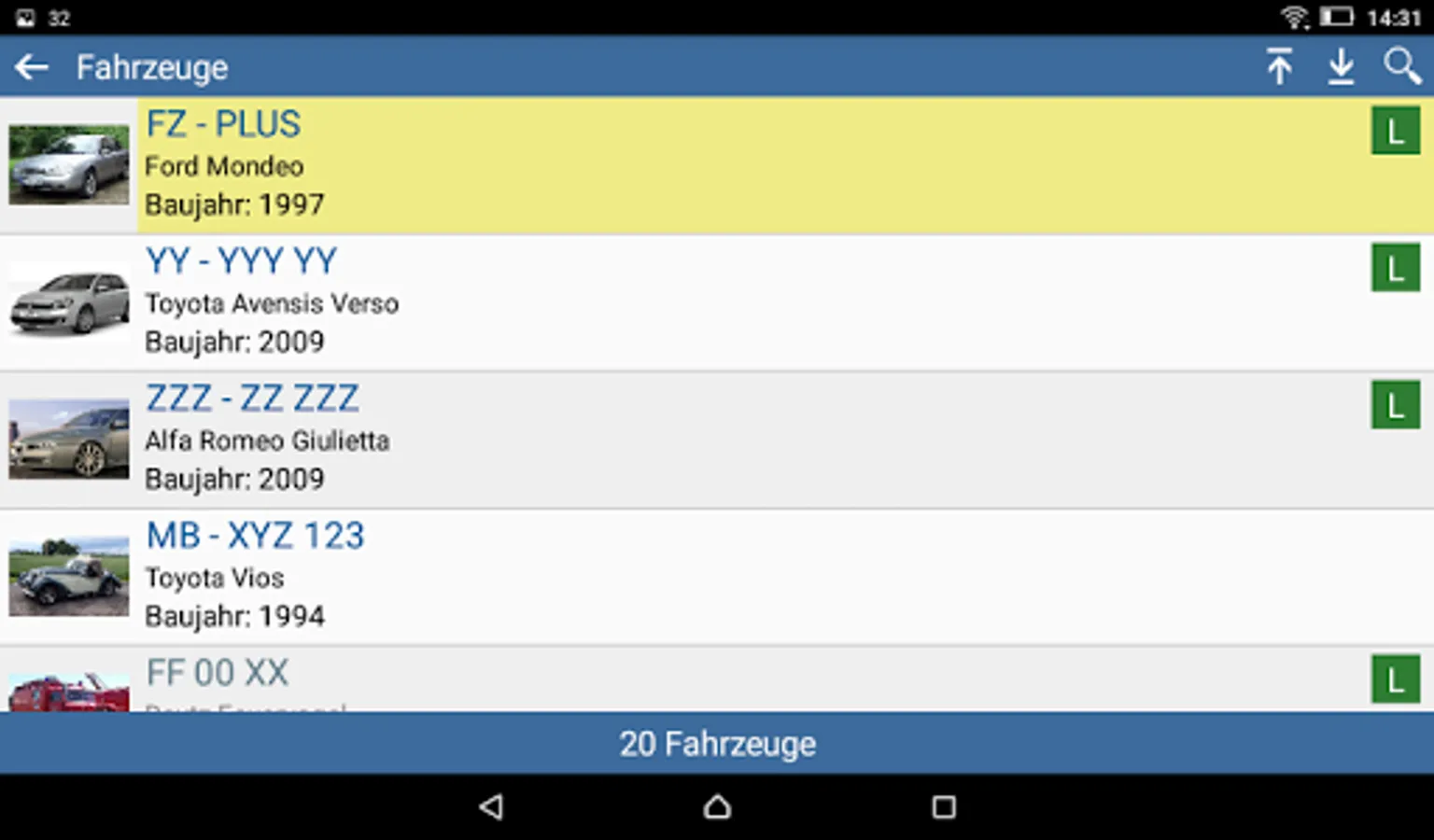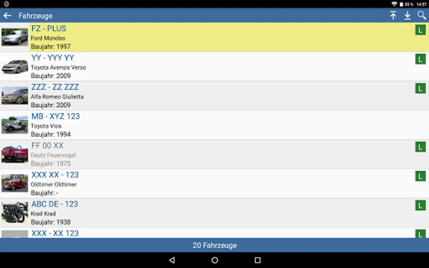 Access on the go with a smartphone or tablet to your vehicle data. Just import your database from Software Plus 5 vehicle and request a list of the master data, regular inspections, driver history, vehicle locations and leasing data. You also have access to the contacts to call driver or companies directly or send an e-mail. Moreover, there is a day and a week available, in which the target date colors are represented for the appointments.