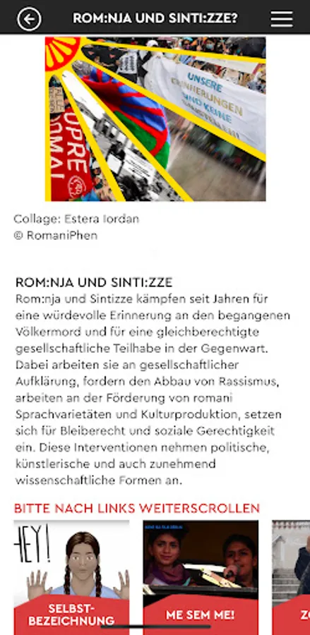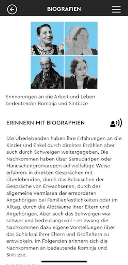 When the Nazi genocide of the Rom:nja and Sinti:zze is discussed, the perspective of the survivors and their descendants is often missing. Therefore, the "TalkingMemories" app aims to focus on the narratives of the survivors and their descendants and the perspectives of resistance. References between history and the present should always be made.