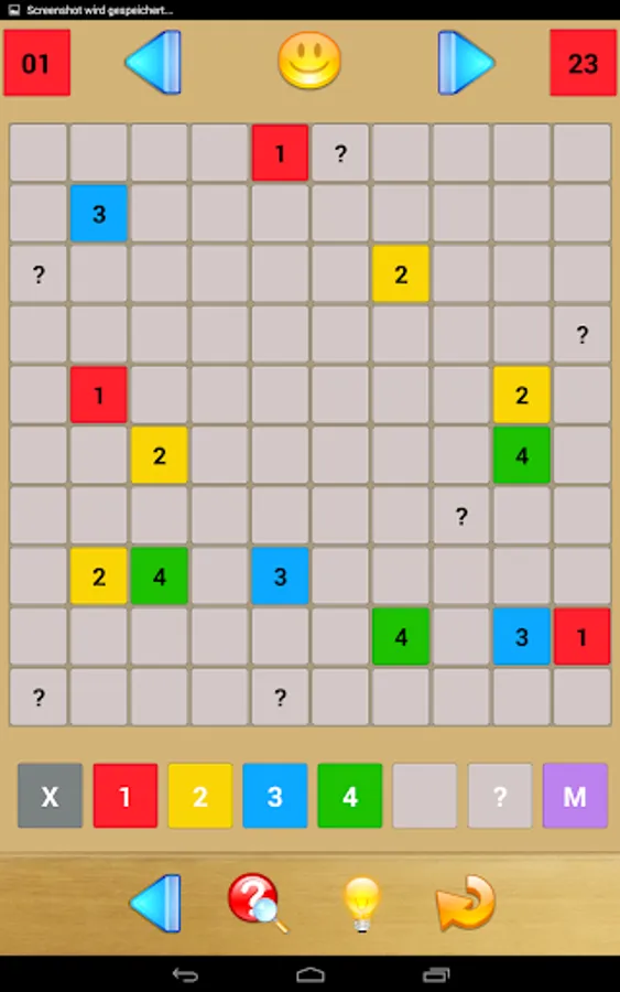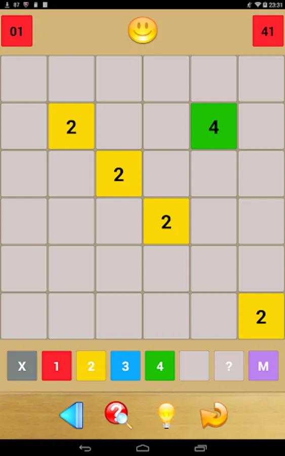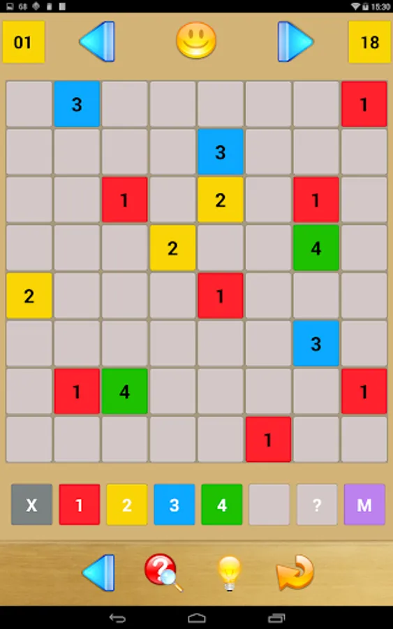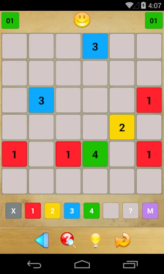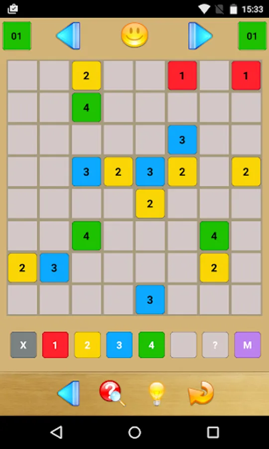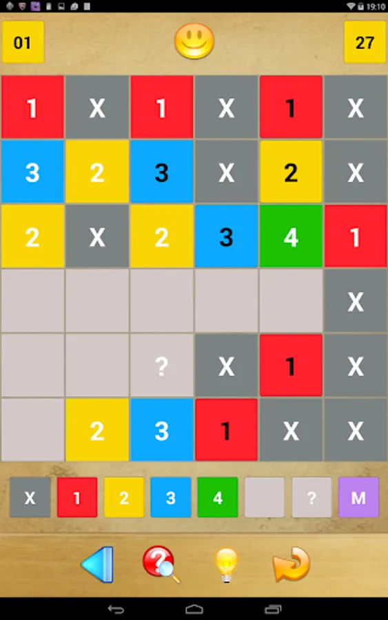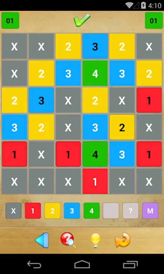 It is your job to fill in all of the grid’s boxes with any of the numbers 1 to 4 or an X. A number indicates how many of the directly adjacent boxes also contain a number (i.e., not an X). Further, two directly adjacent numbers must not be identical.