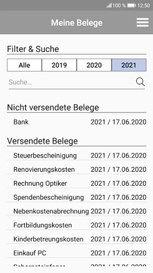 Darüber hinaus bietet die App eine Übersicht Deiner versendeten und nicht versendeten Belege mit jahresspezifischer Filterfunktion und einer Volltextsuche.