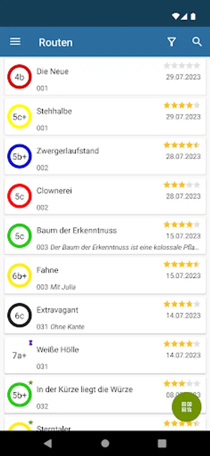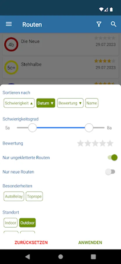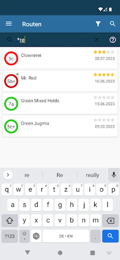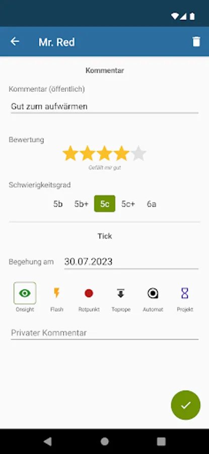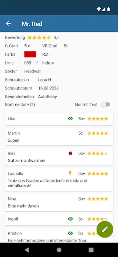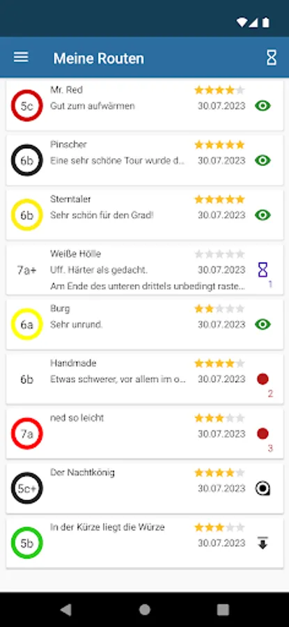 You can rate routes according to difficulty and beauty, make your own comments and read the comments of other users before getting started. In addition, you can maintain your personal tick list to keep an eye on your projects or to find routes in the hall that have not yet been climbed.