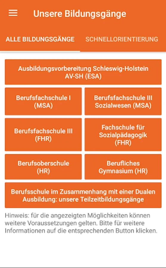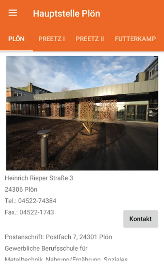 The app provides information about the Plön vocational training center. This includes the courses offered with a quick guide to the requirements for the individual courses.