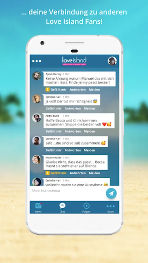 During the TV broadcast, the chat is open in the LOVE ISLAND APP so that you can chat directly with other "Love Island" fans.