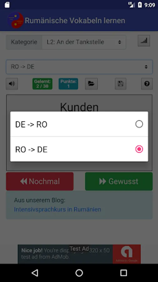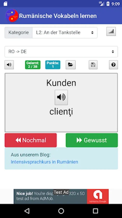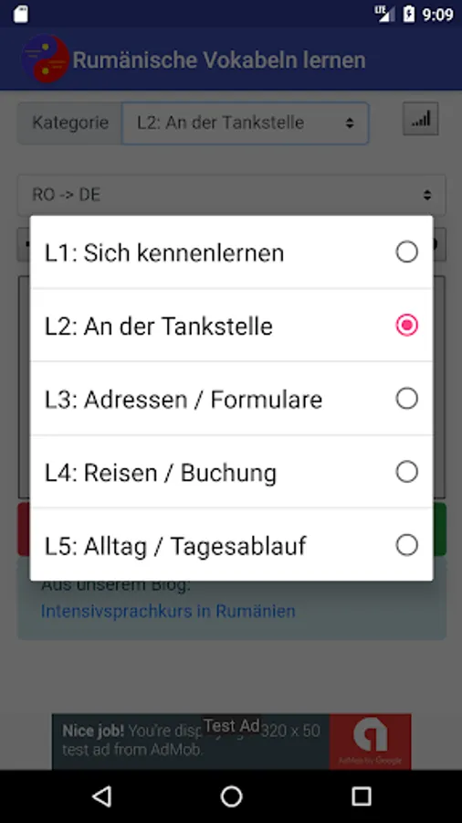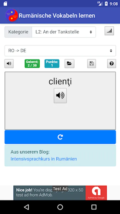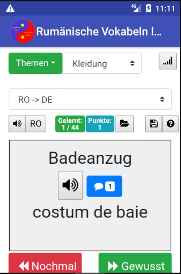 With this app, you learn Romanian vocabulary either different topic areas or only the words unserers free online course for the Romanian language, you'll find under https://www.rumaenisch-lernen.de.