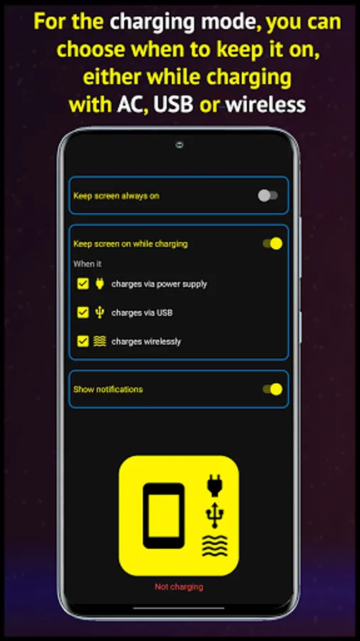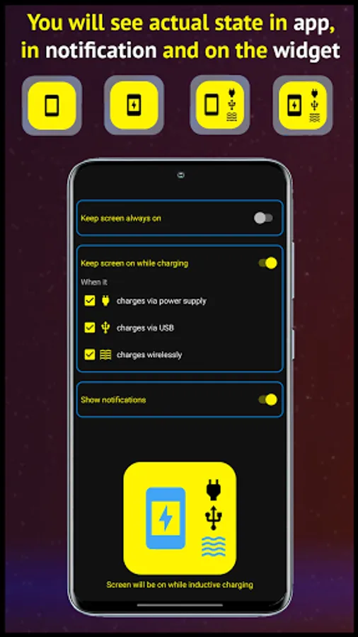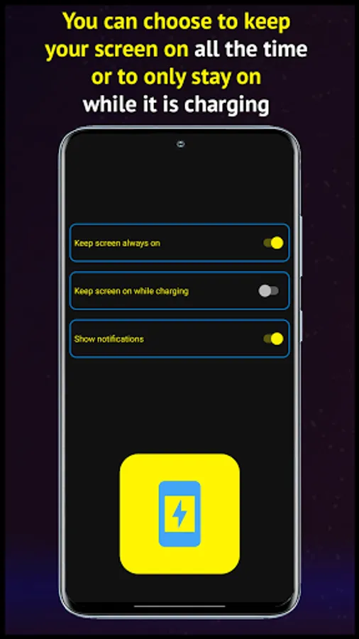Keep the screen on while charging or at all times. Sometimes you need to keep your phone's screen on at all times, e.g. while driving or when you use your smartphone as a weather station. This app allows you to set up your device so that the display does not turn off.