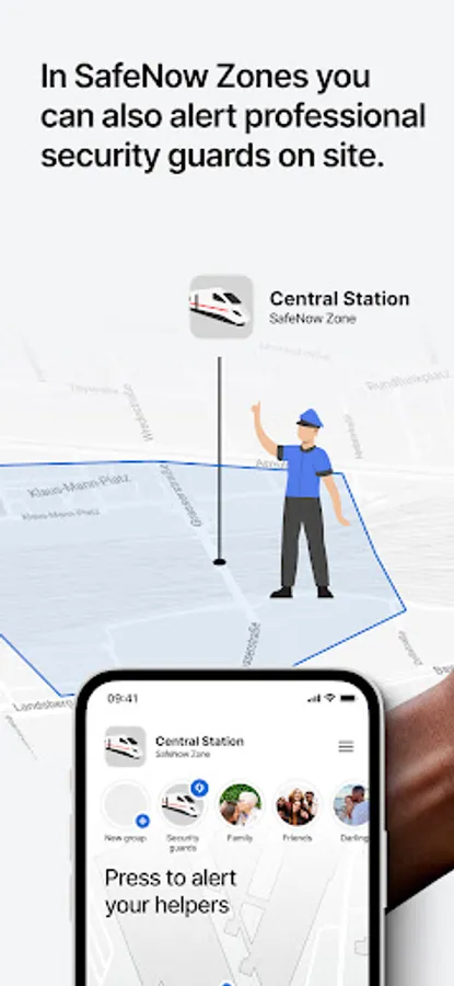Within a public SafeNow Zone, you can reach professional helpers on site. The app automatically displays when you're in a SafeNow Zone and tells you if helpers are available.