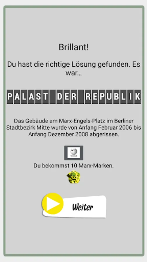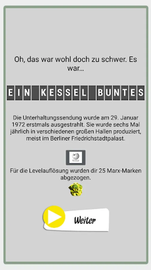 The level resolution, whether known or fall only detected using, contains useful information on the fugitives. So you learn not just what role Helge Hahnemann borrowed the voice, but also get background information on Karl-Marx-Stadt or naturist in DDR photo quiz. A small morsels of knowledge, so to speak. Link there on top, behind which find very thirsty for knowledge even more (usually to Wikipedia).