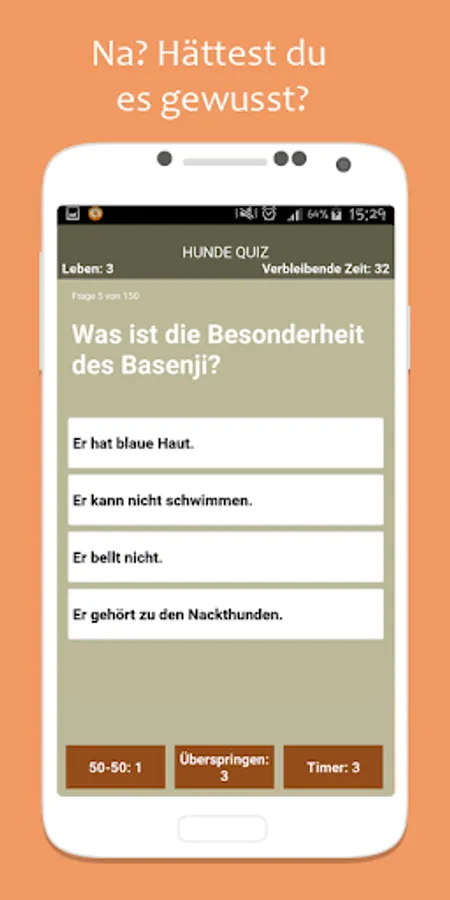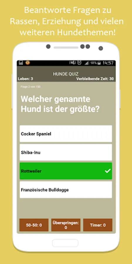Did you ever wanted to know which famous dog first in space was? Do you know the real name of Commissioner Rex? Do you know what breed of dog has a blue tongue or what breed is known not to bark? What should eat dog and what is not, as is a puppy housebroken and which dog sports are there? As a real dog expert simply moved to the new, German Dog Quiz to find out the answers!