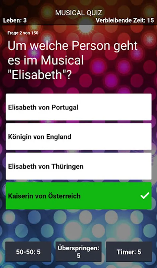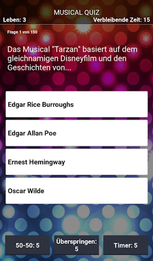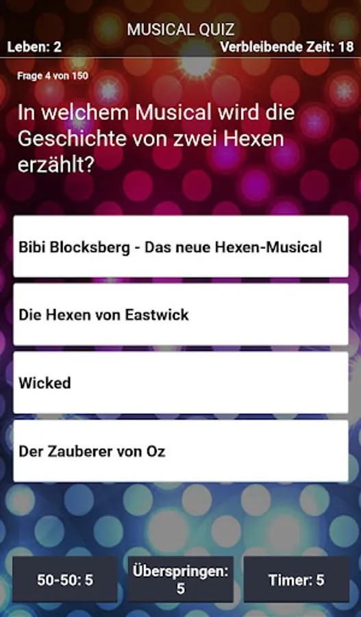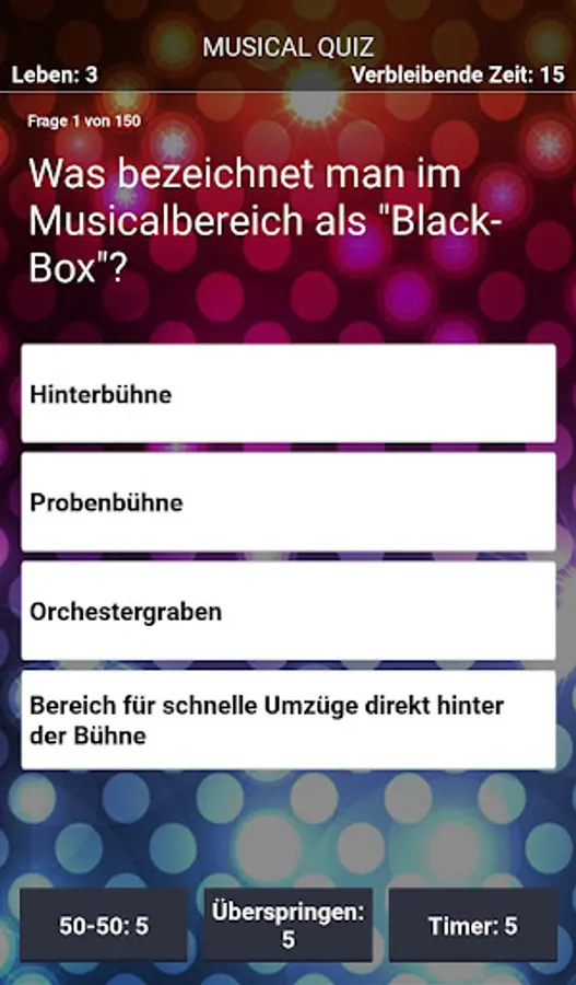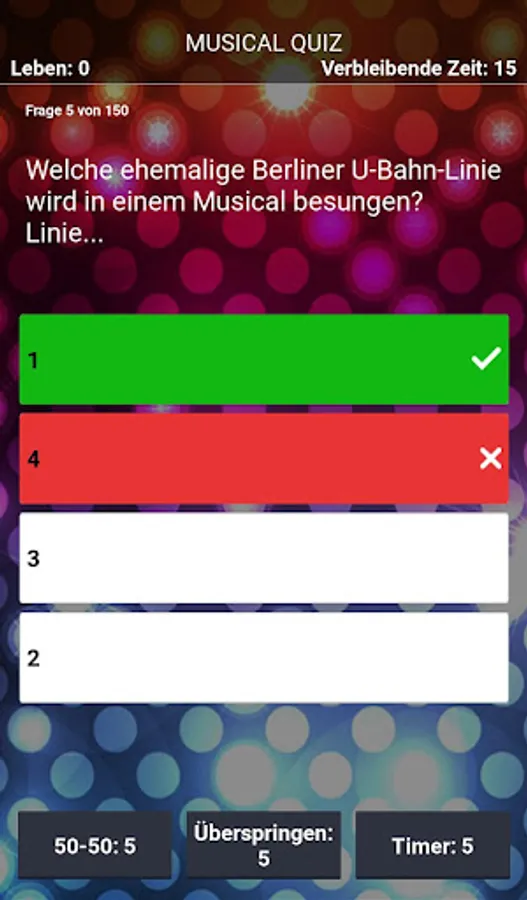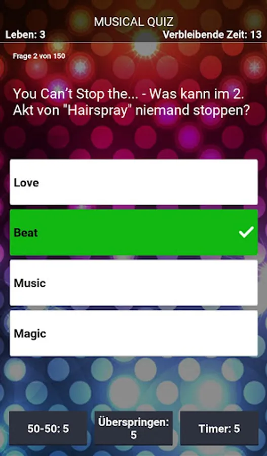 Each question is given according to the classic principle with four possible answers, of which only one is correct. To increase your chances, you can use one of three jokers. But don't think too long, because the timer is ticking mercilessly! Achieve the high score of the most correctly answered questions and share it with your friends via the Google Play Leaderboard. The questions and their answers were developed and checked by musical fans. :)