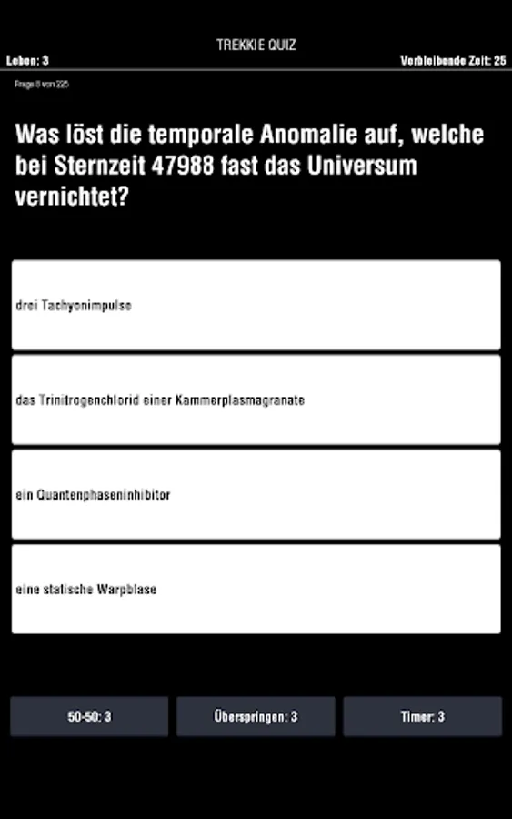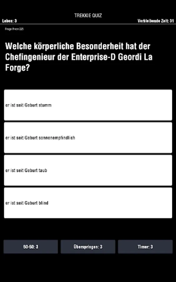 The Trekkie Fan Quiz is the best preparation for your Starfleet career. Get it now on your Android in Quarks Bar, at Guinan in Zehn Vorne, at Neelix in the Casino or download it here on Earth from Google Play! But be careful, it's more addictive than the Ktarian game that Riker brought back from Risa.