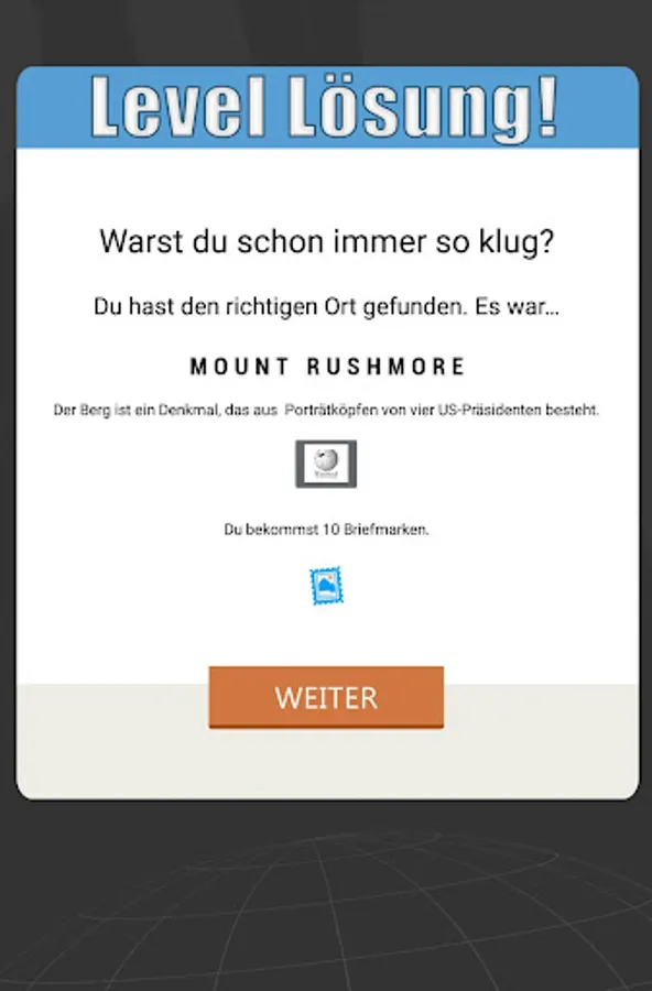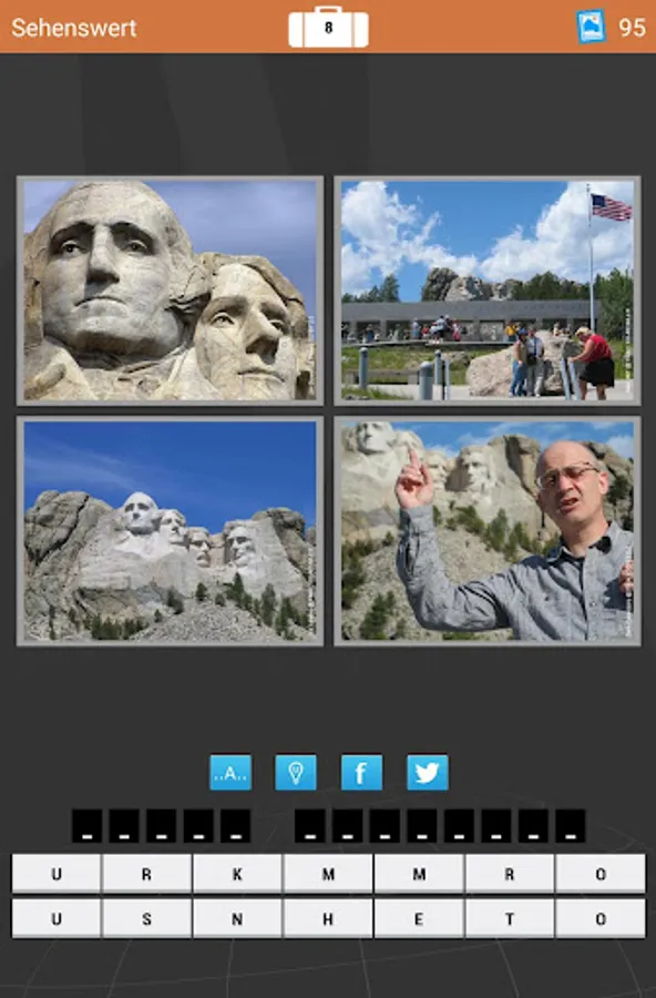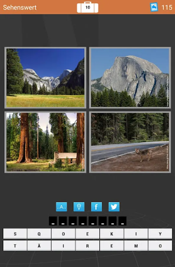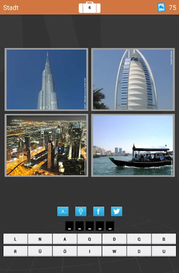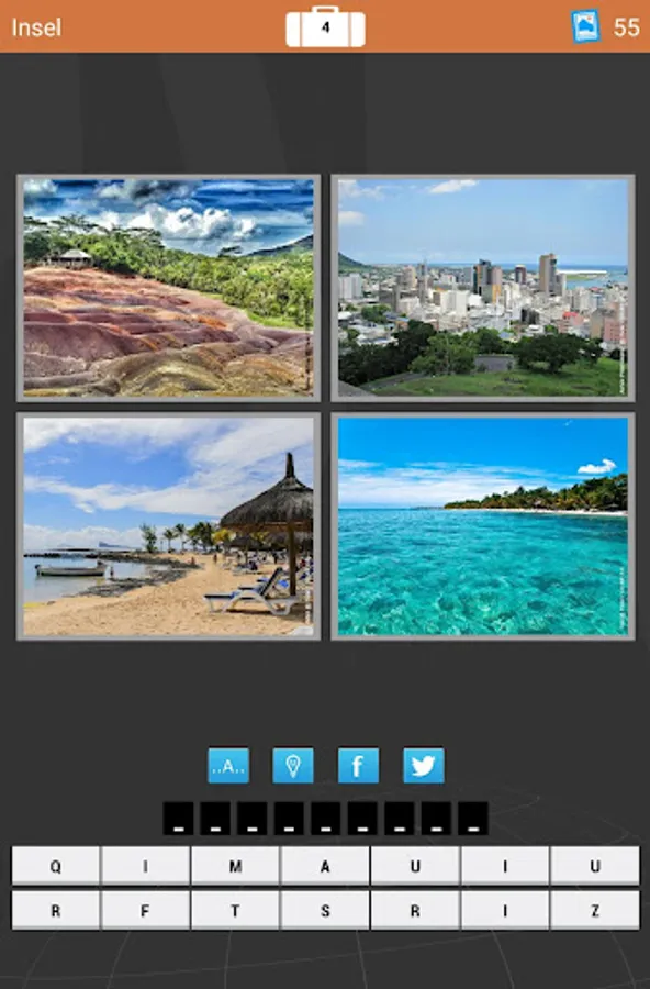You will be shown 4 pictures and you have to find the right place! Indulge in vacation memories or embark on a journey into strange realms with photos of sights, well-known buildings and locations. The locations are assigned to certain categories, such as City, Country, State, Island, Continent, Leisure, Work and Sights. In updates come even more.