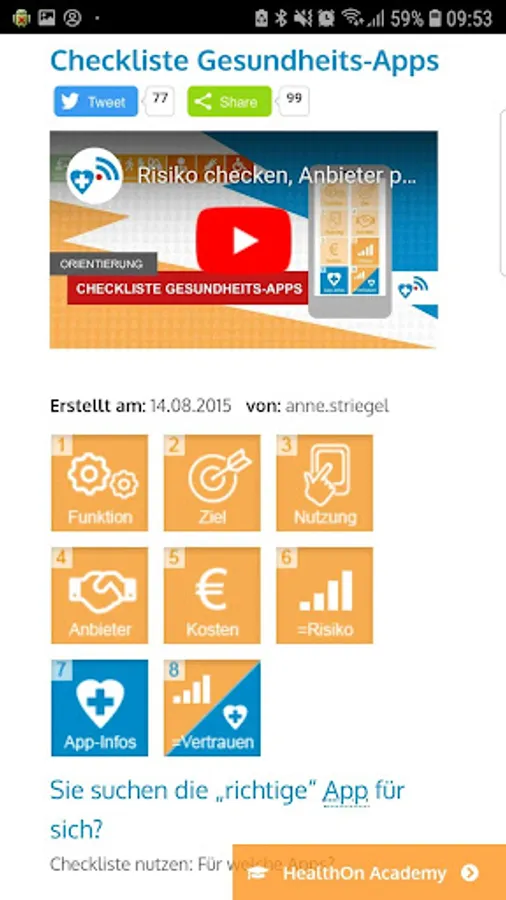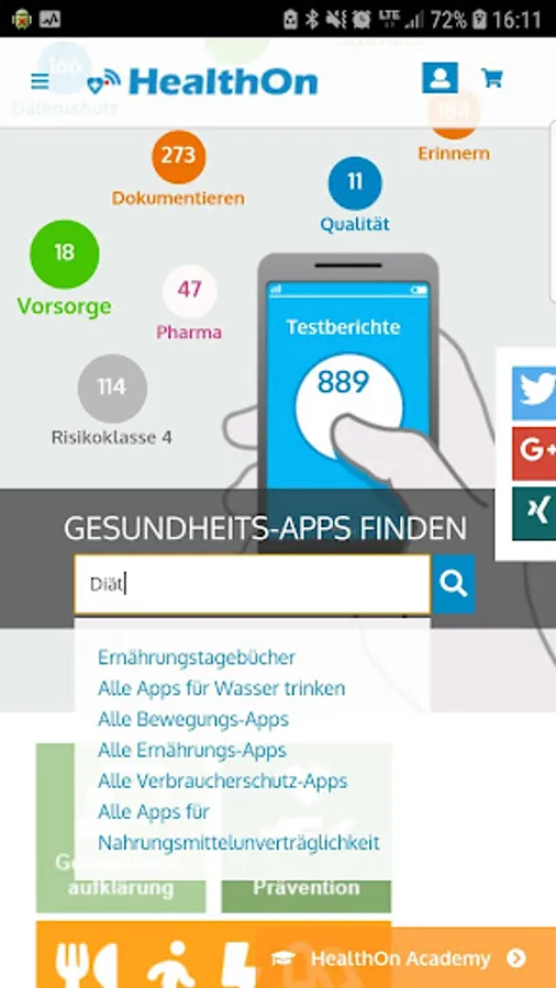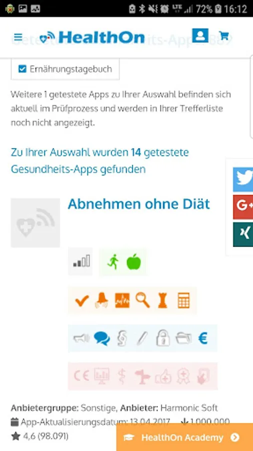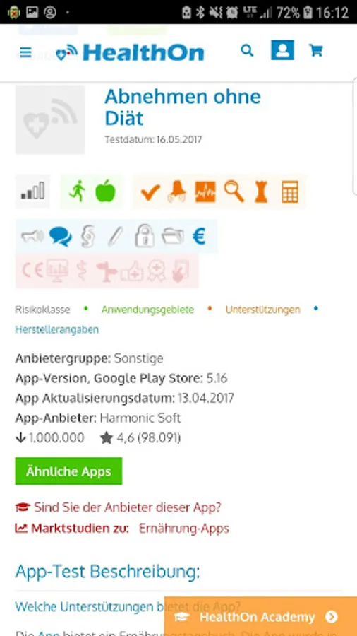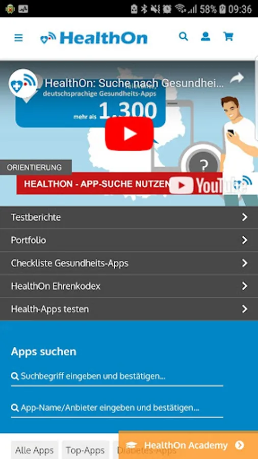 You are looking for health apps that you can trust? HealthOn can help you with more than 950 independent reviews of German health and medical apps, such as: For nutrition, diabetes, hypertension, pain, pregnancy, contraception, sleep, relaxation, rehabilitation, care, cancer, allergy, asthma / COPD etc.