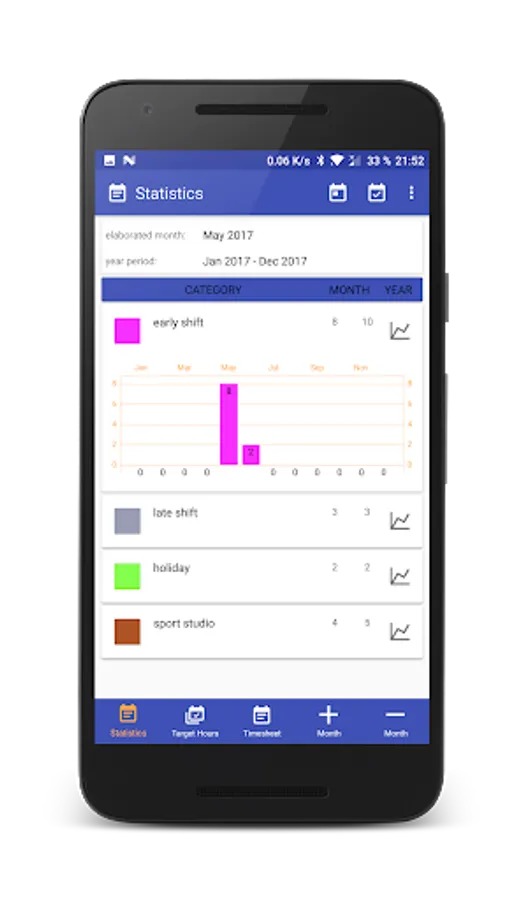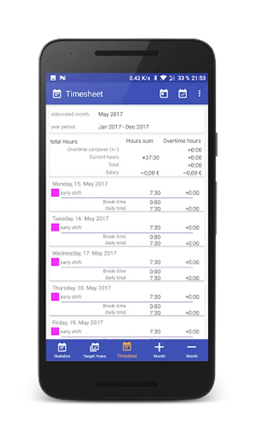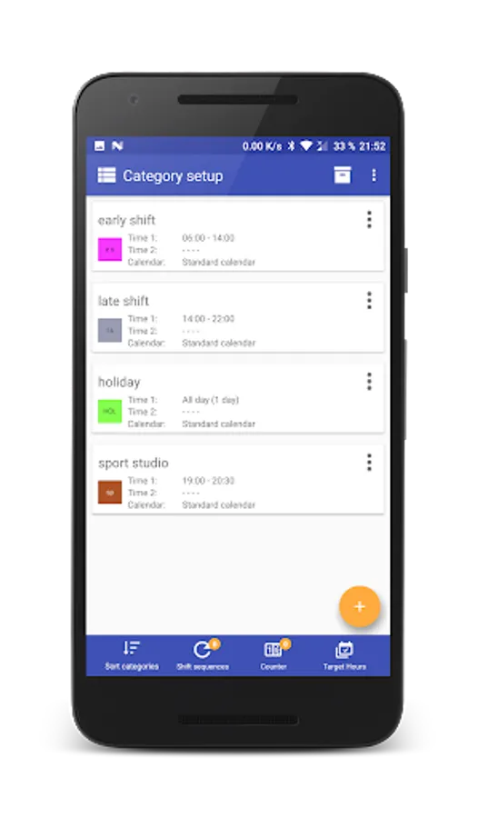 Setup categories that will serve as templates to be easily used when entering shifts later on. You can even combine several categories to a more complex work schedule. Different kinds of counters will help you keeping an overview of shifts, work hours or even resulting salary.