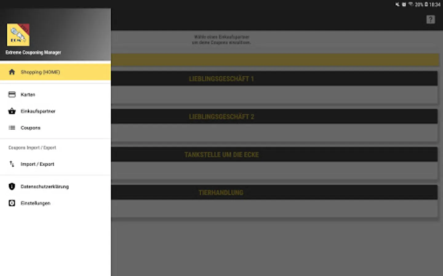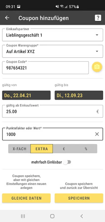 After you have created your coupon partners (the stores in which you want to use the coupons), you can start to deposit the coupons. These are then sorted according to partner, value, expiry date including barcode. This entry is made either by entering the EAN code, by camera, via screenshots or via the import function (see below)