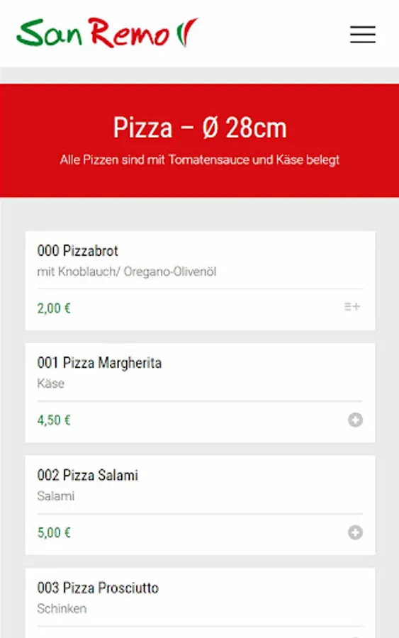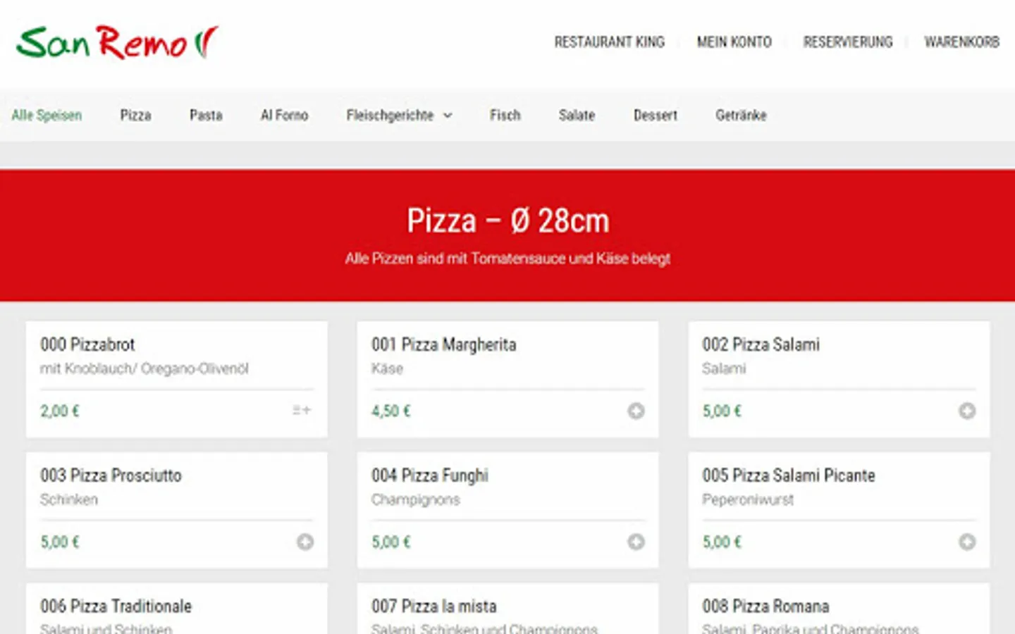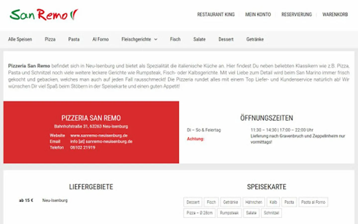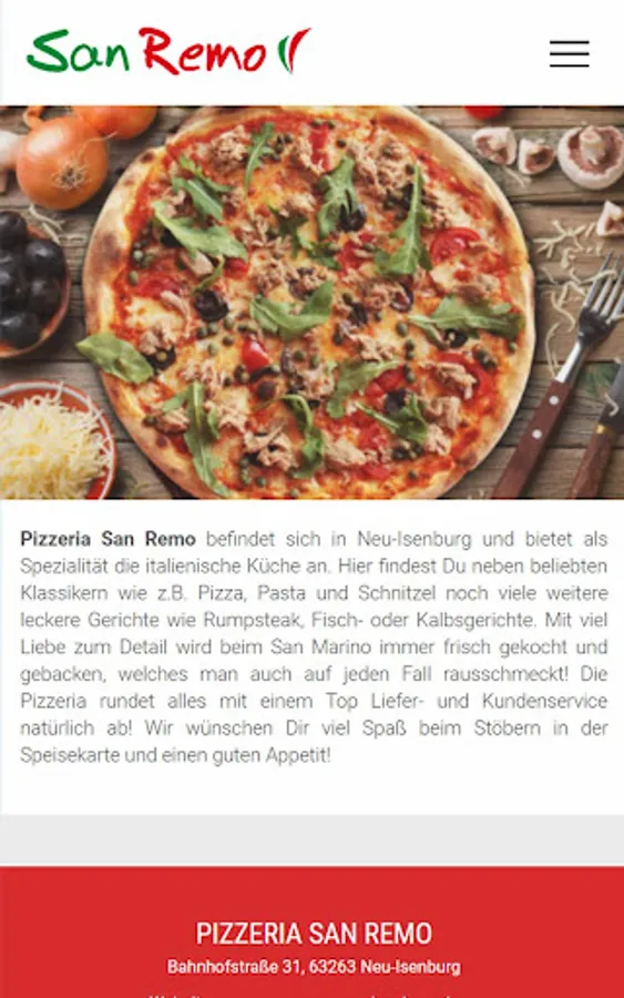 Pizzeria San Remo is located in Neu-Isenburg and offers Italian cuisine as a specialty. Here you can find popular classics like Pizza, pasta and Schnitzel, many more delicious dishes such as rump steak, fish or veal dishes. With great attention to detail is always freshly cooked and baked at the San Marino, which one also in any case rausschmeckt! The pizzeria completes everything with a top delivery and customer service of course! We hope you enjoy browsing the menu and have a good appetite!