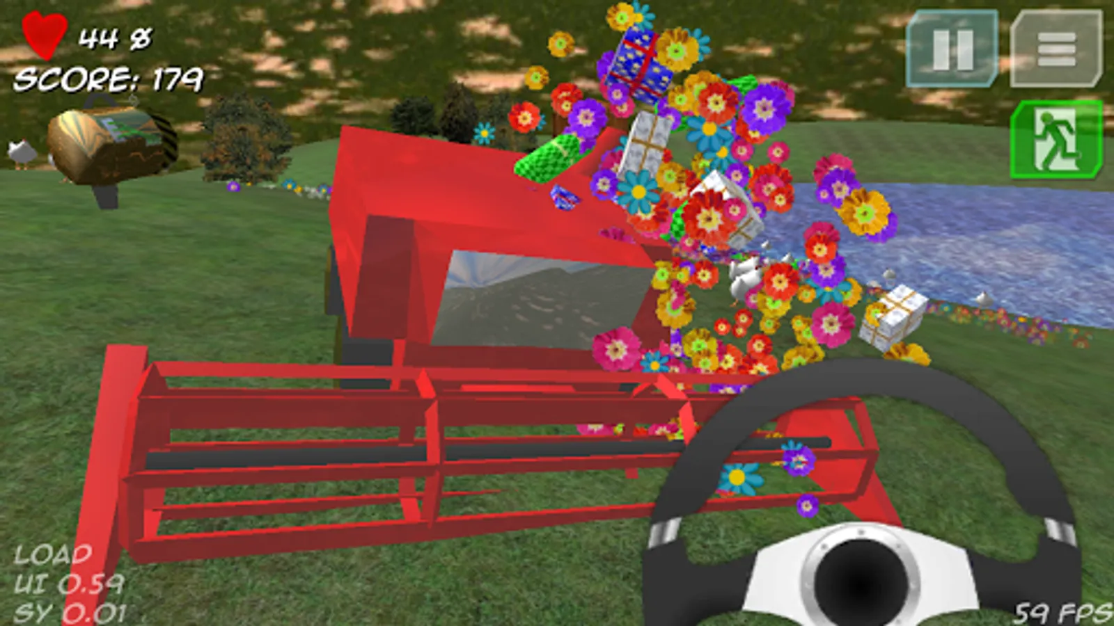 • the harvester can be controlled using the accelerometer or an on-screen steering wheel. Tap the pedal for reverse, tap screen to honk.