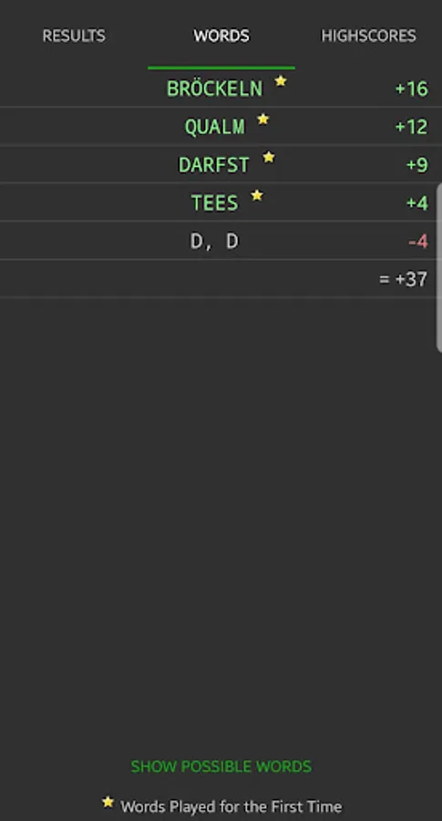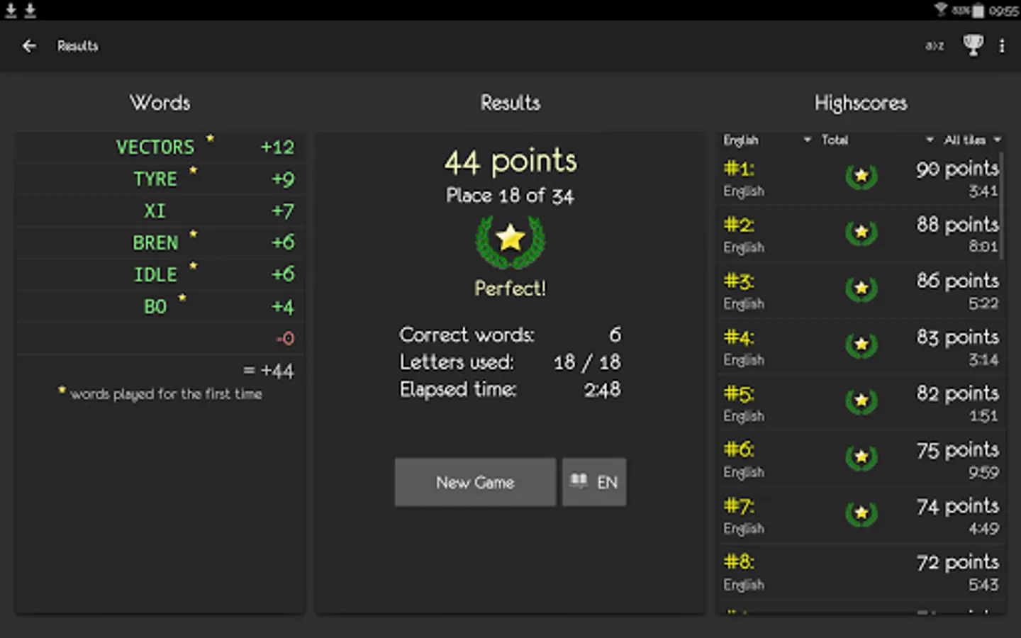 In the word list you can find all the words you ever played. The local highscore list helps you keep track of your achievements. You can also upload and compare your scores with other players in the online ranking list.