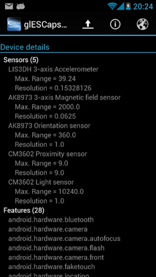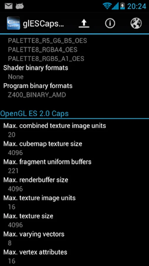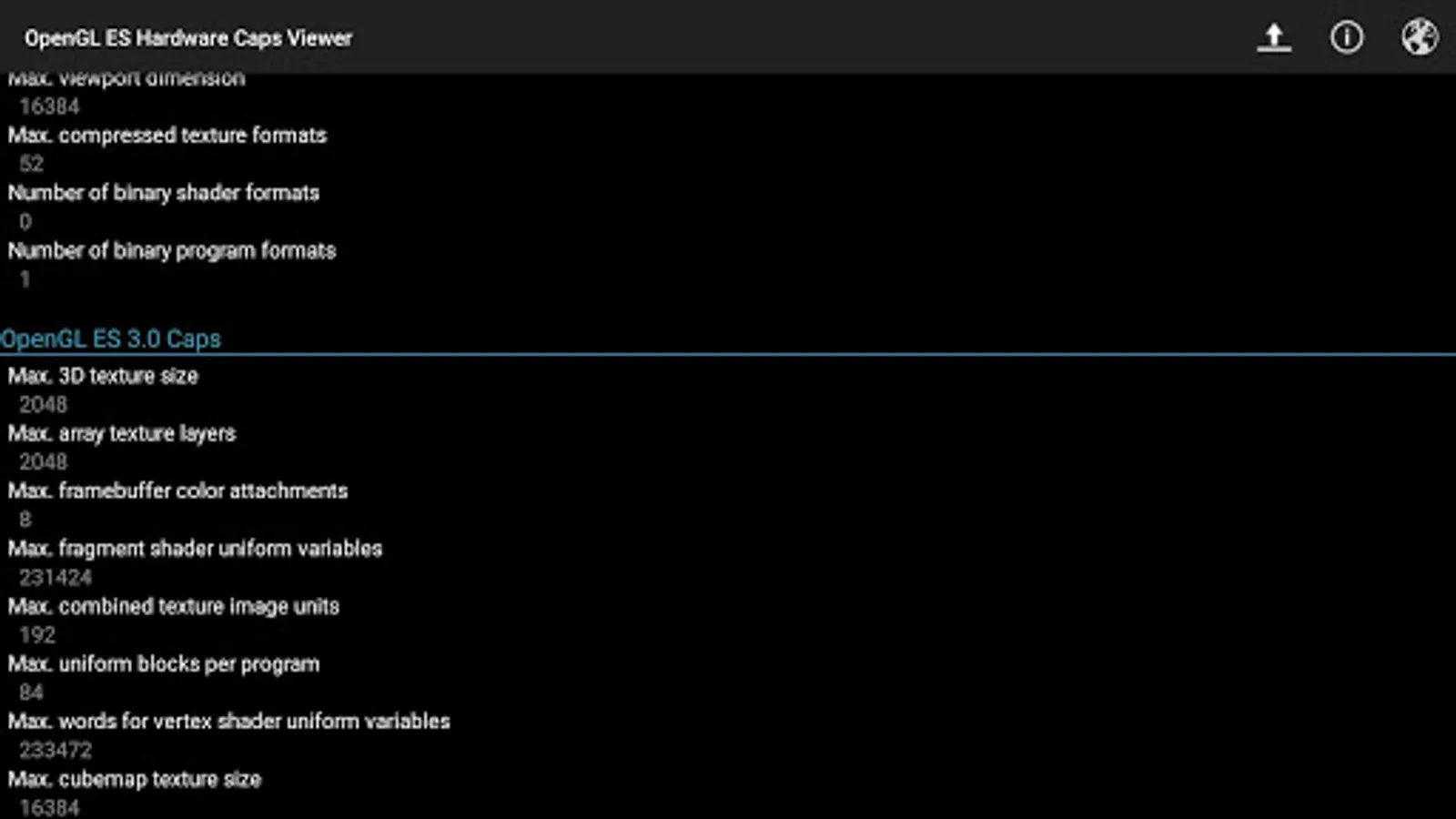 The OpenGL ES Caps Viewer is the mobile equivalent of the OpenGL Caps Viewer for Windows, Linux and Mac OSX.