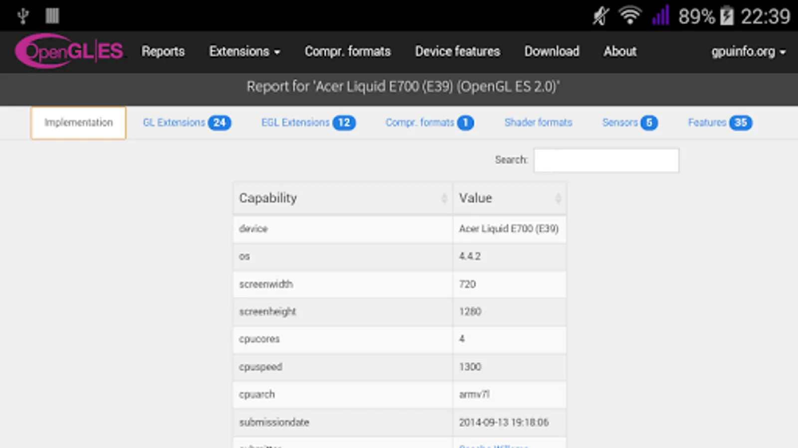 These hardware reports can then be uploaded to a data base (http://opengles.gpuinfo.org), from where they are available to the public, so that other developers can check out OpenGL ES implementation (and device) information, filter e.g. by availability of extensions and compare devices to check out capabilites of their target platforms.