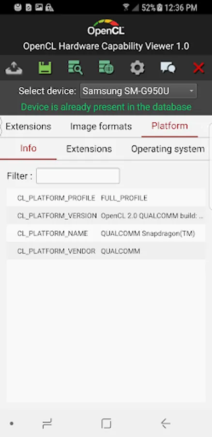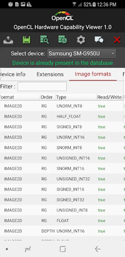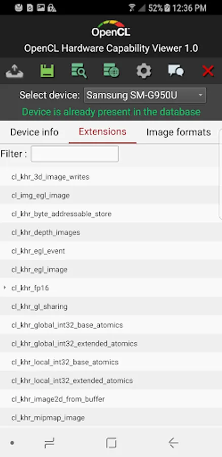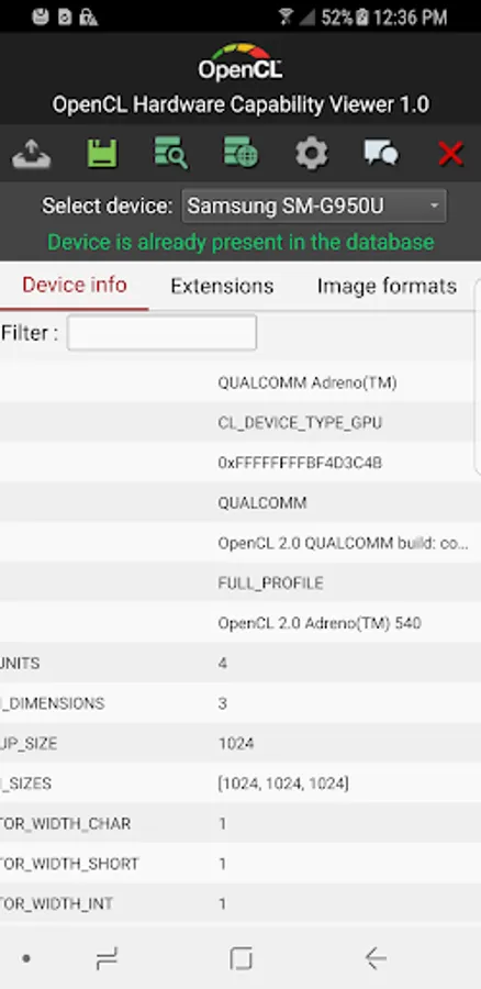 The reports generated by this tool can then be uploaded to a public database (https://opencl.gpuinfo.org/) where they can be compared to other devices on different platforms. The database also offers global listings to e.g. check how widely features and extensions are supported.