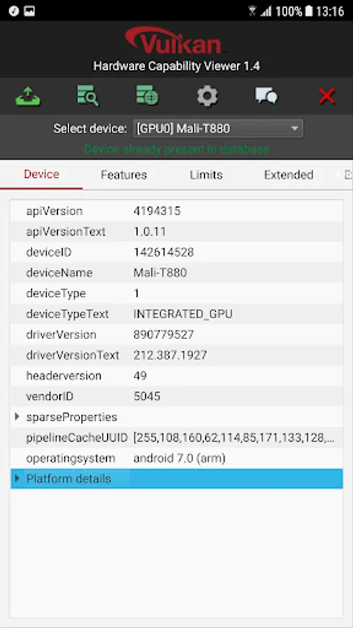 The Vulkan Hardware Capability Viewer is a client tool aimed at developers to gather hardware implementation details for devices that support the new Vulkan graphics and compute API including: