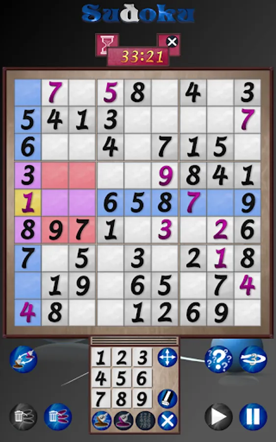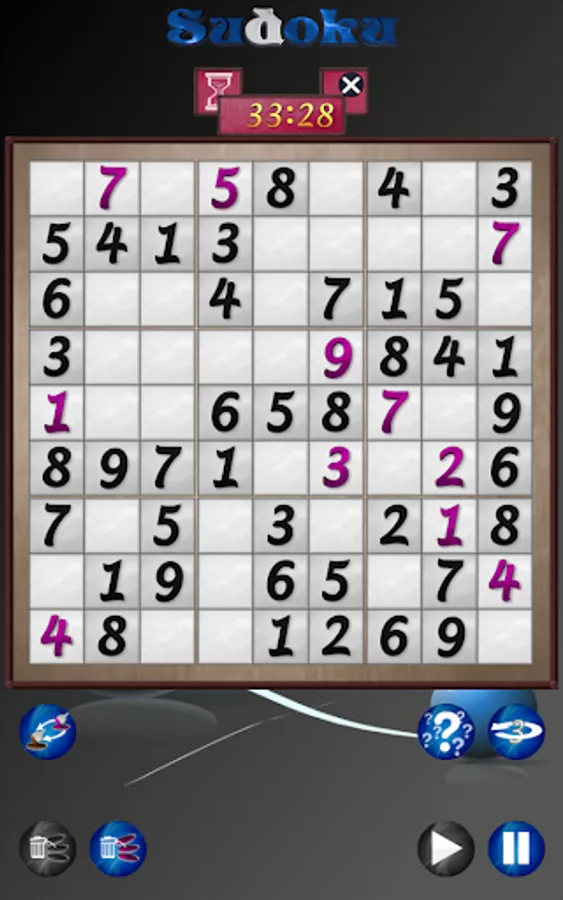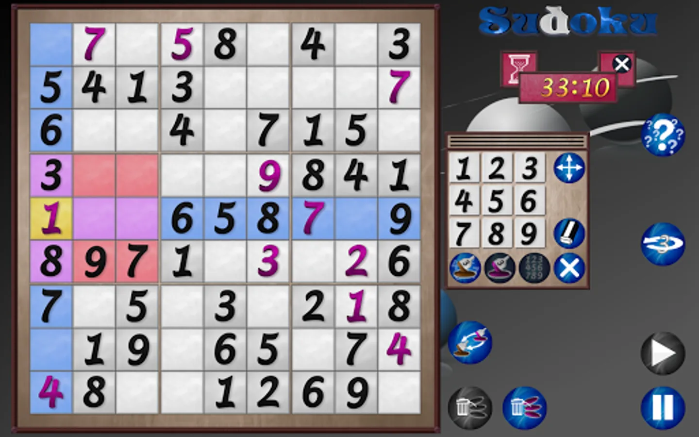 This game is a Sudoku game following the standard Sudoku rules. It comes with tons of levels and five difficulty settings. It offers some convenient options to enter the numbers (mini numbers as hints and different colors for trial runs). Full undo support is available (allows undo of all actions, including color change or 'delete all').