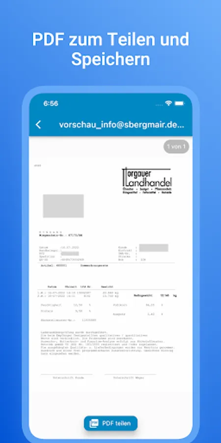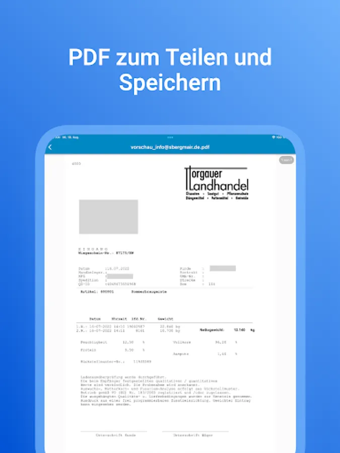 With the app from Torgauer Landhandel and agricultural wholesaler Stefan Bergmair, you can view, save and share your receipts, weighing slips, credit notes and much more as PDFs. As a result, your documents are sent to you securely and you can view them at any time.