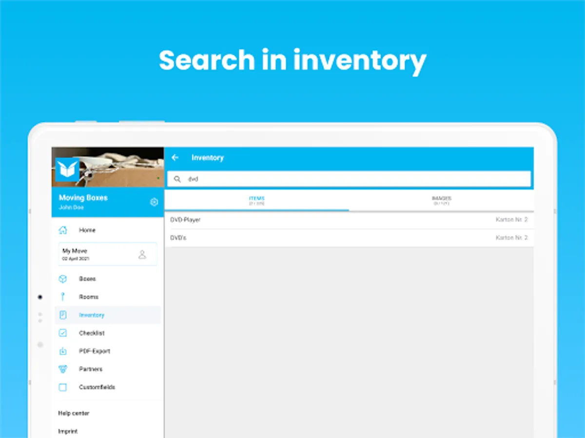 With the app MOVING BOXES you manage your boxes and find everything by full-text search again.