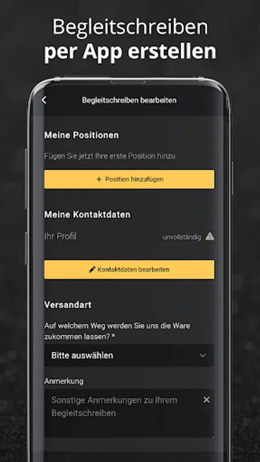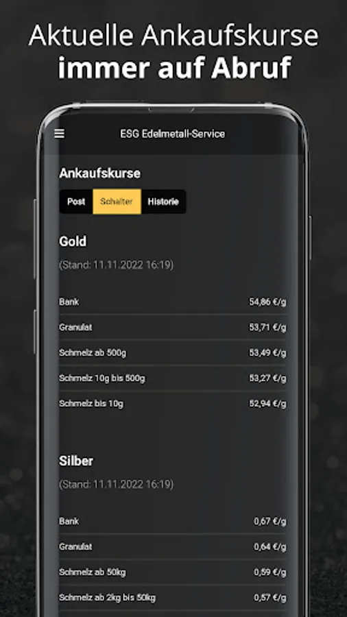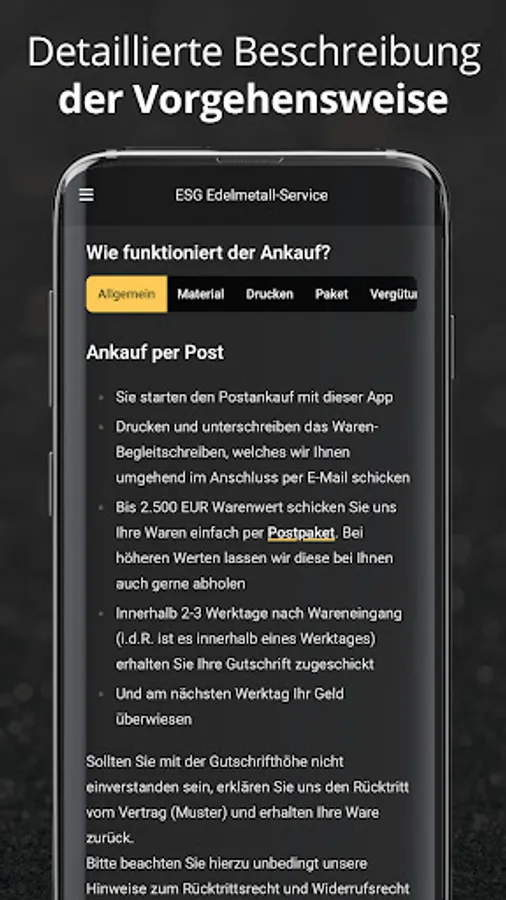 The ESG gold purchase app allows you to record your goods simply and easily and to create the accompanying letter required for shipping.