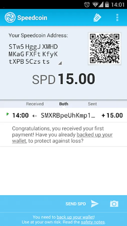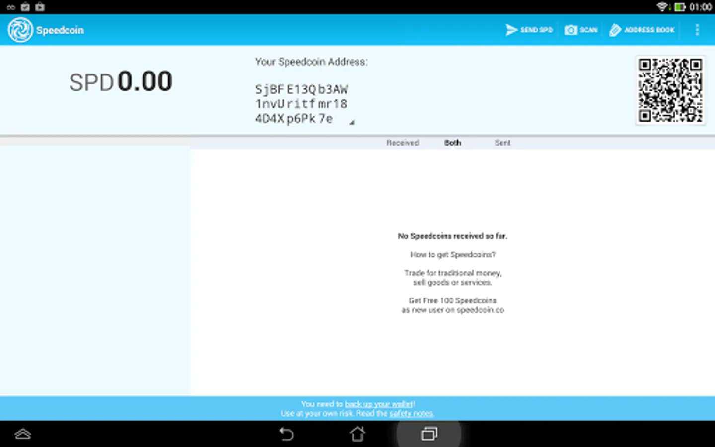 • Sending and receiving of Speedcoin via NFC, QR-codes or Speedcoin URLs.