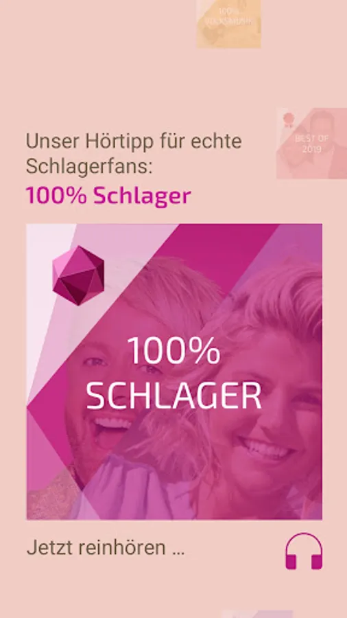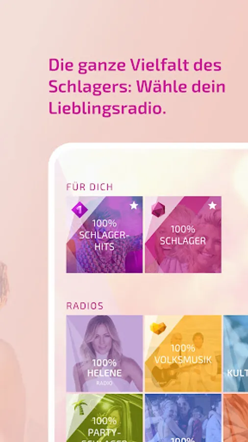 The whole world of pop music in one app. Regardless of which hit style you fancy, all of them are included in this app and just a click away: Holidays for the ears can be found under 100% summer hits. Current pop hits are waiting for you under 100% hits. The biggest hits, medleys and live songs by Helene Fischer are available on 100% Helene. For folk music there is the station 100% folk music and the greatest hits from Andrea Berg and her friends on the exclusive 100% Andrea radio channel. The 100% Roland Kaiser radio is new.
