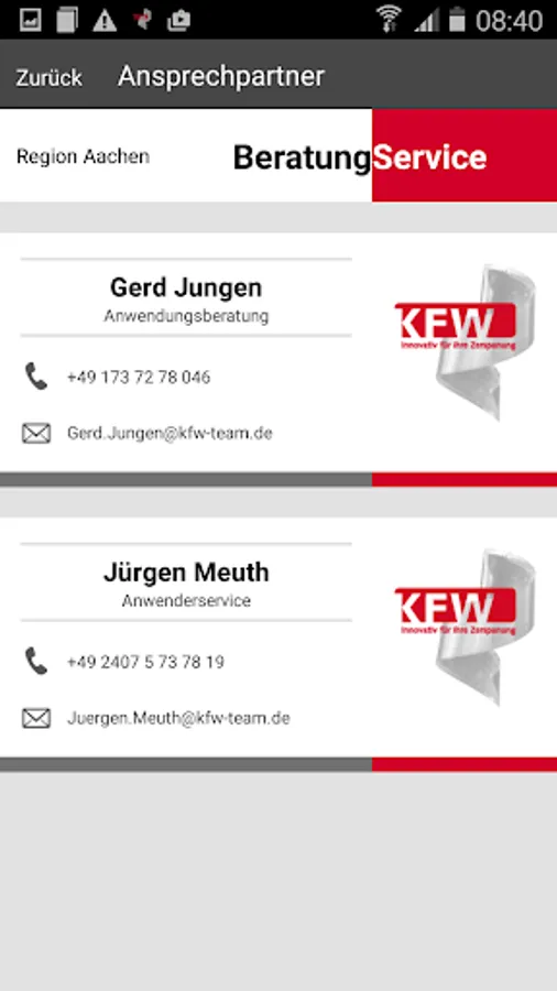 With KFWapp you find your contact with PWN team. All phone numbers and email addresses are available for you in KFWapp and can be selected directly from there.