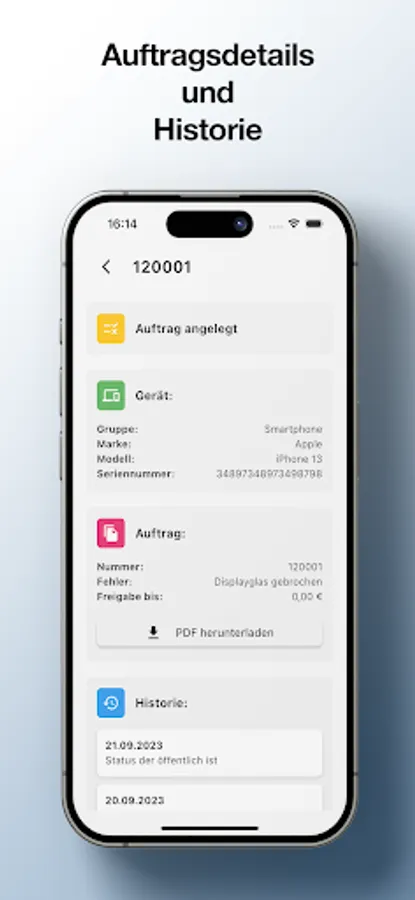 Job details and history: You can view detailed information about each job, including the steps taken during the repair. The history allows you to track exactly when which action was taken.