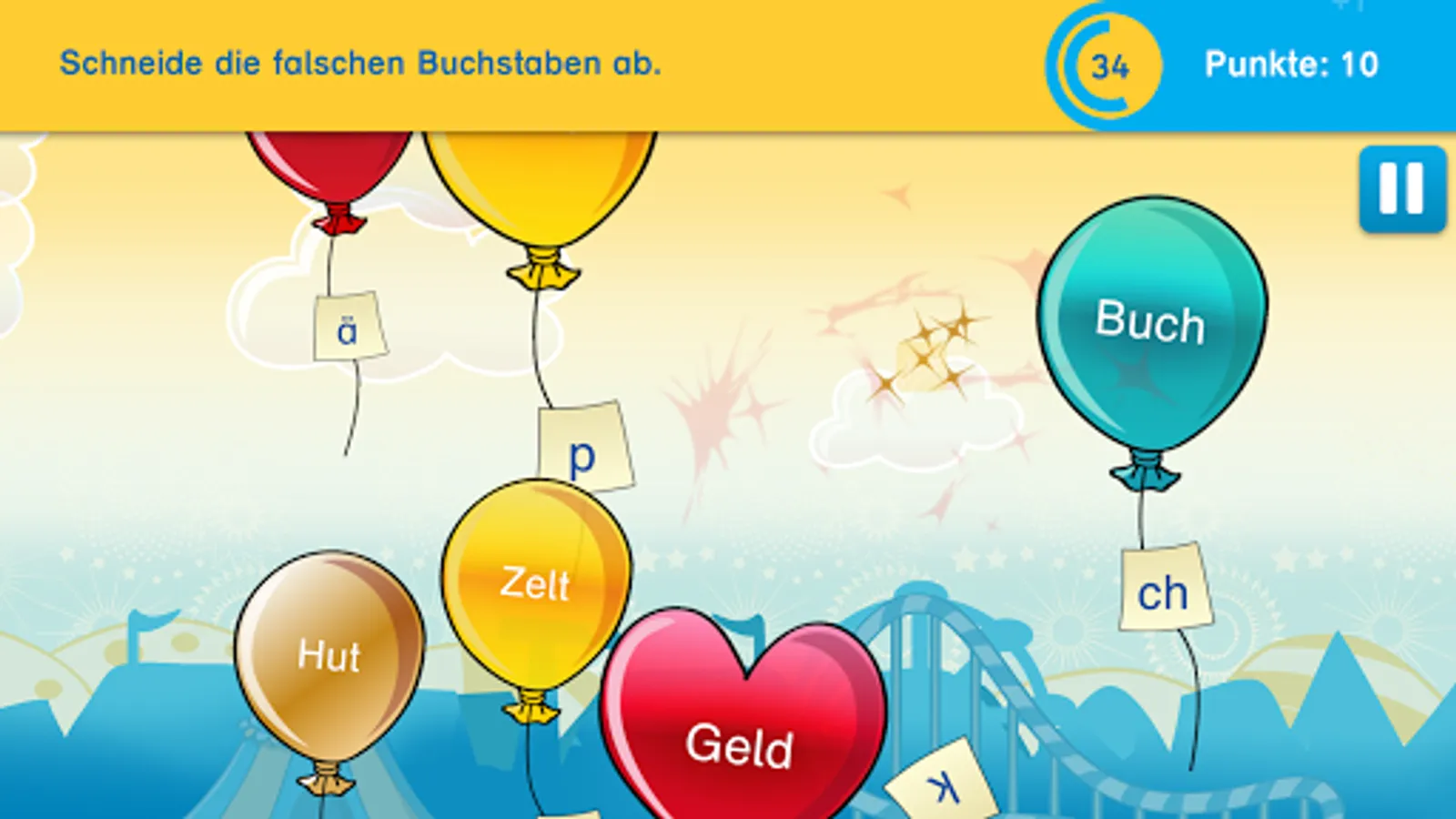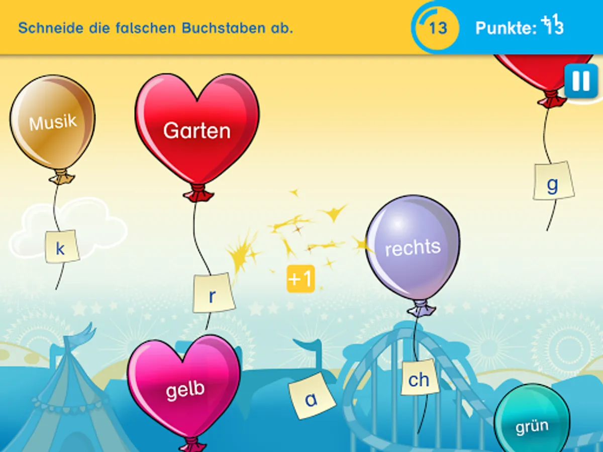 This exercise, the views span and concentration. The eye of the children must wander over the whole pitch, as always adding new balloons. Through the concentrated look and reading is to be perceived in a short time whether the letter fits on the balloon to the word in the balloon. First reading skills and abilities to promote it.