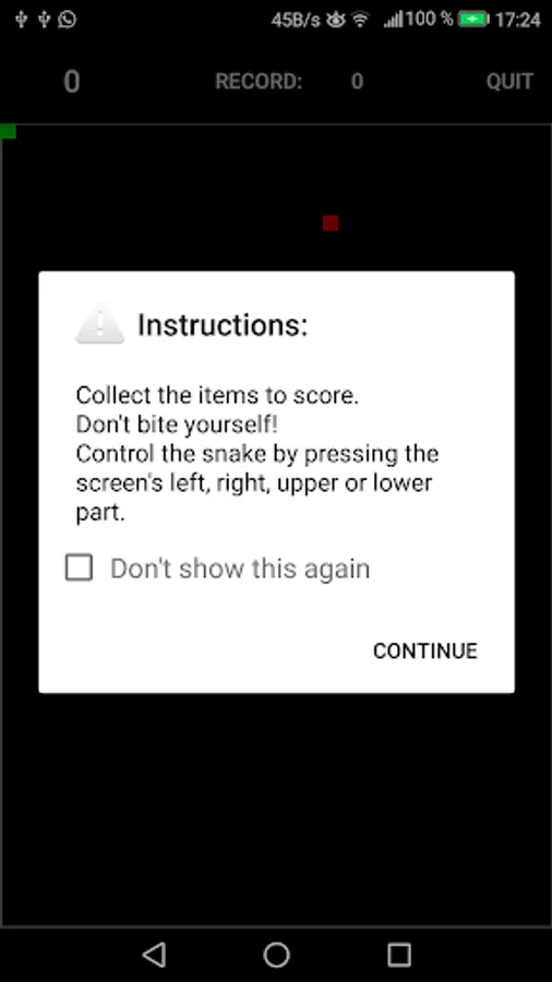 Control the snake by tiping on the screen's left, right, lower or upper part. Score by collecting the items. If you bite yourself, the game is over.