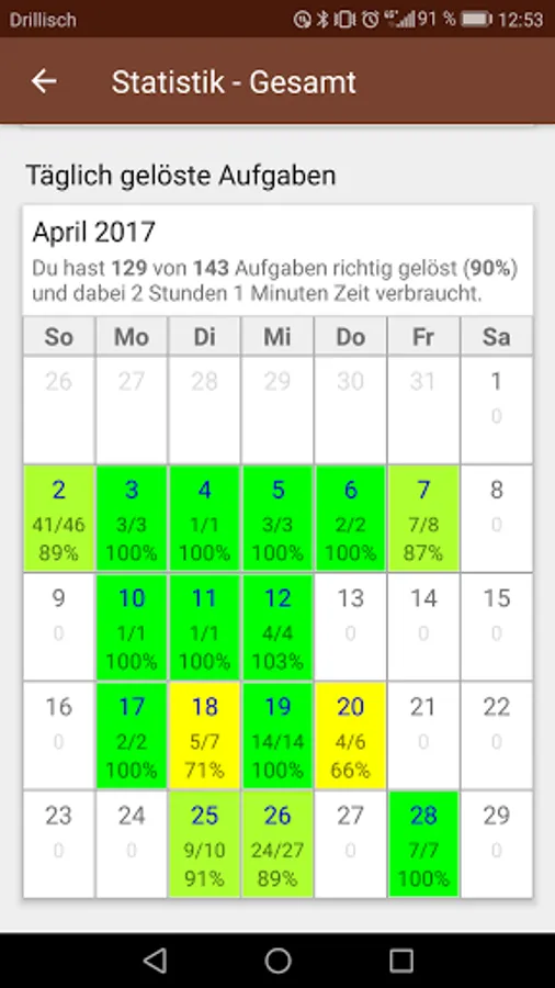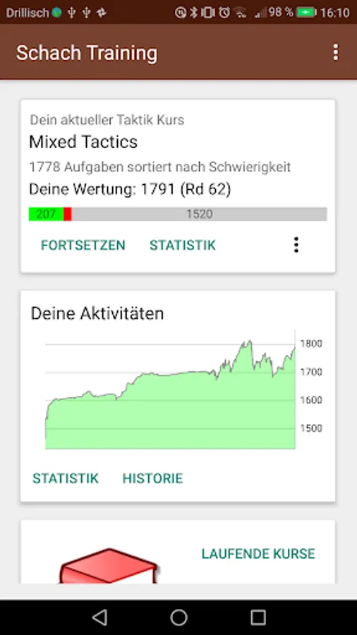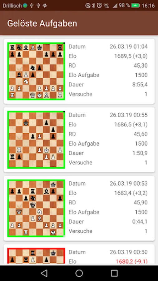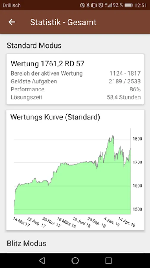 Based on your performance you will receive a rating and can also see the development of your strength in graphic form. The solved tasks can be viewed in a history and also repeated.