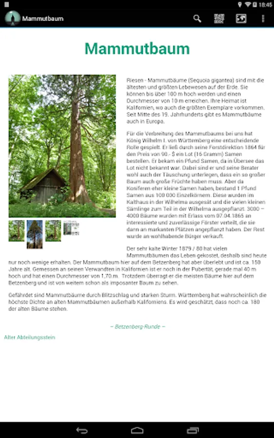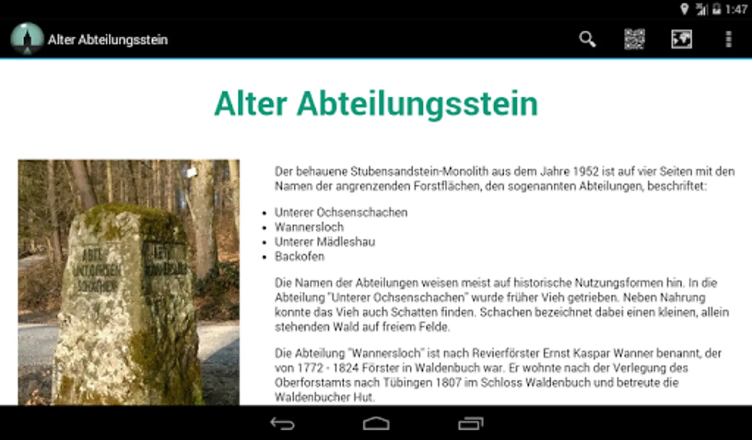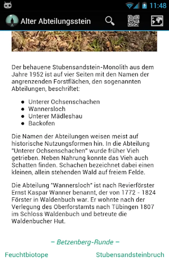 On the Highlights of selected tours in the forest small metal plaques with QR codes were placed. If the app installed, delivers the smartphone after scanning the QR code information on the nature and small monuments, which the user then directly can easily lead to heart on site.