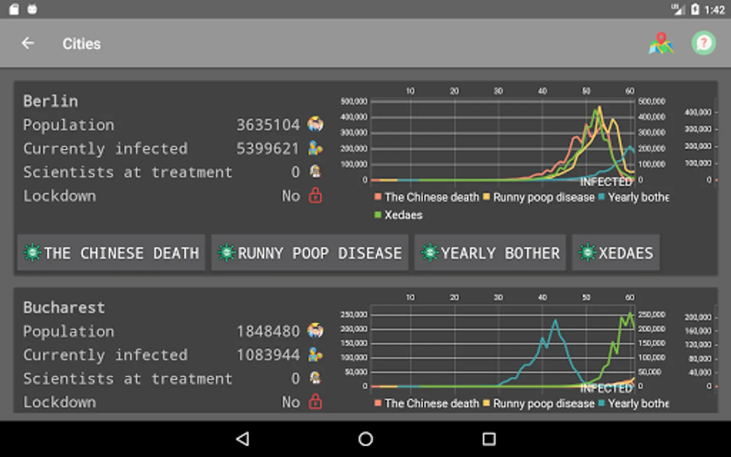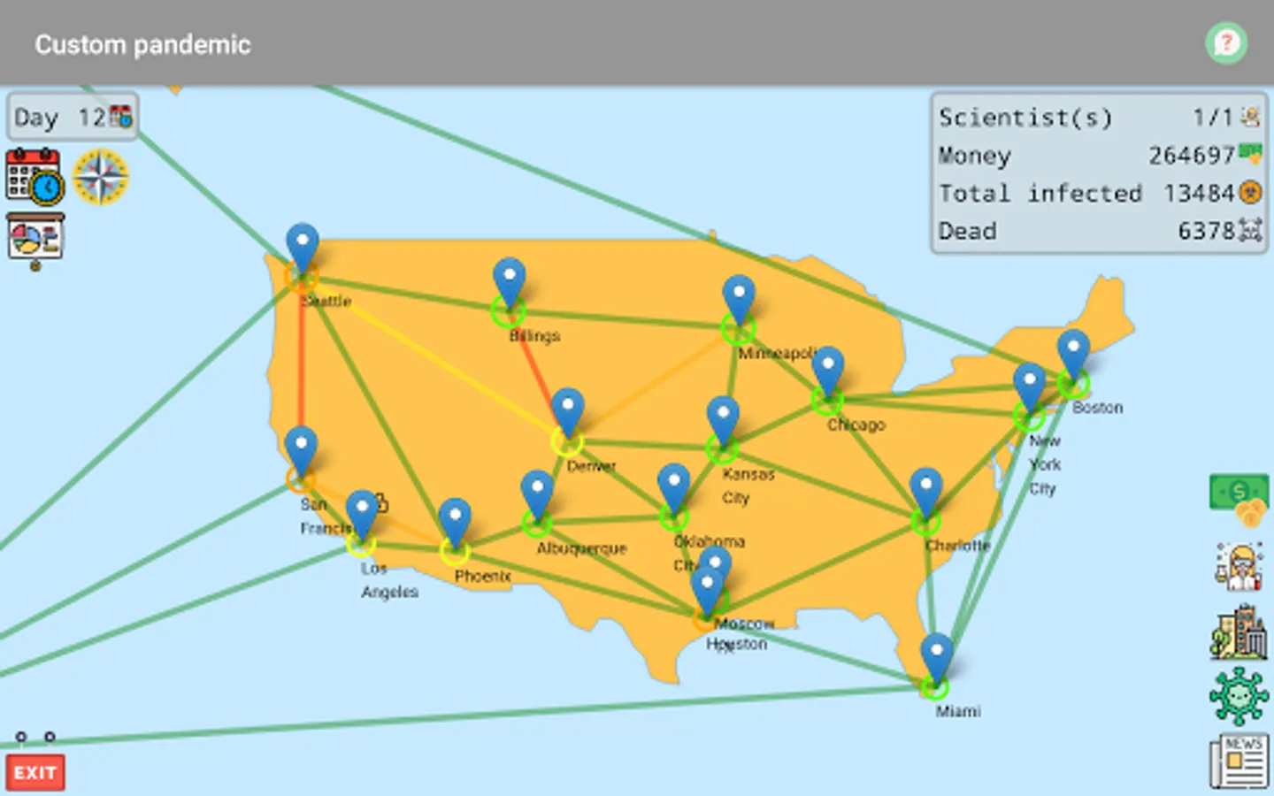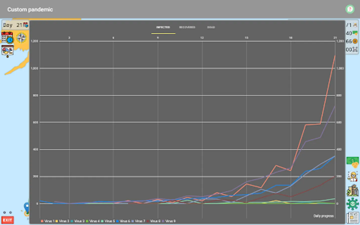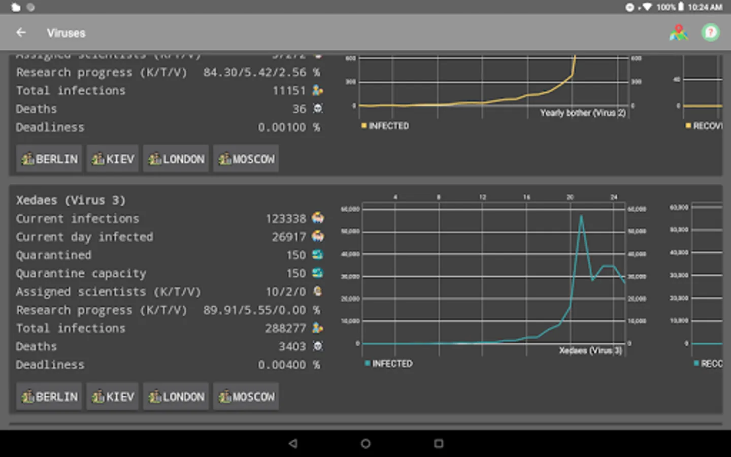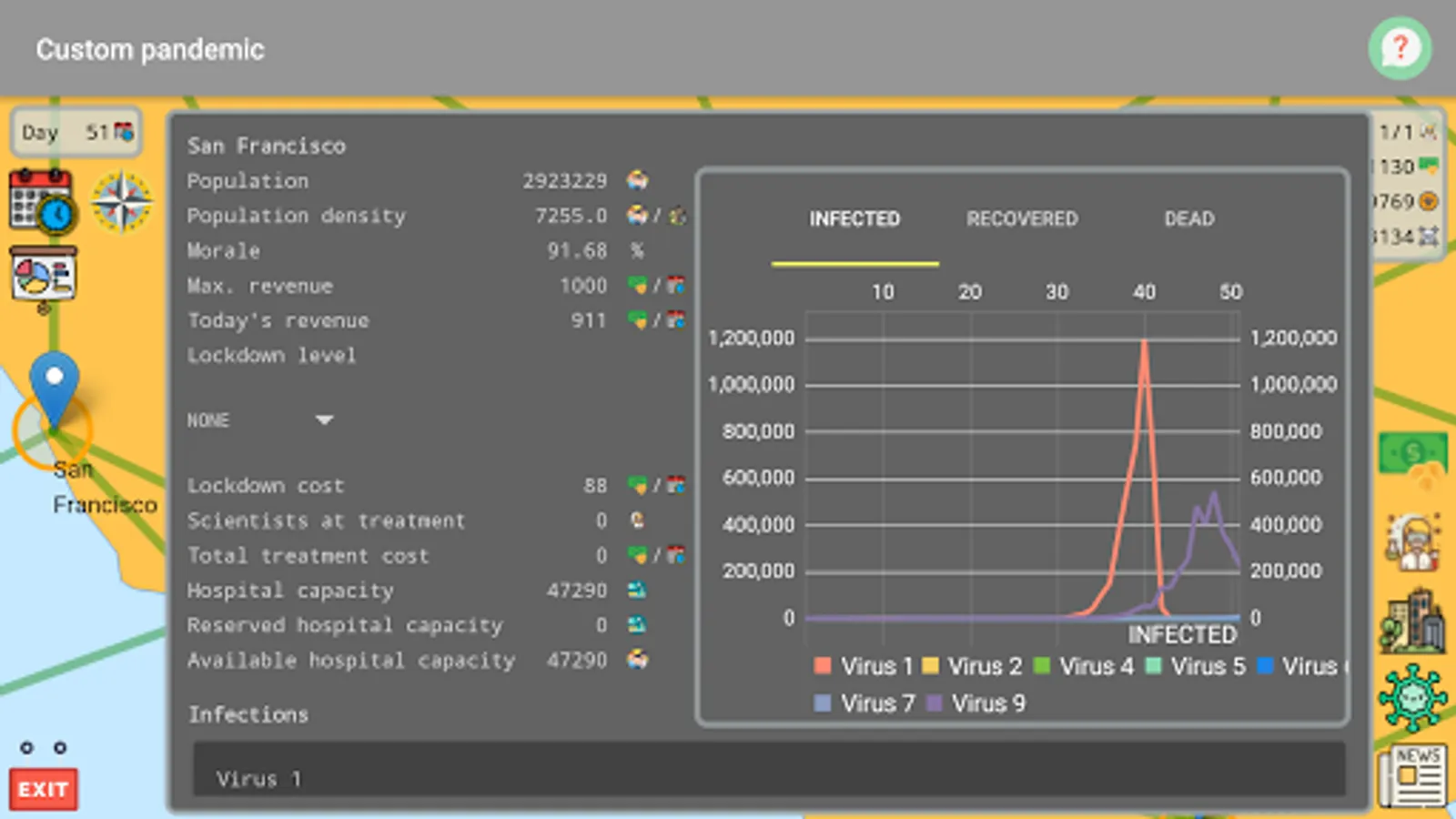 Suddenly viruses break out in different cities. You are in charge. Hire scientists. Control the different categories of research. Order quarantines and lockdowns. Figure out which virus is the real threat.