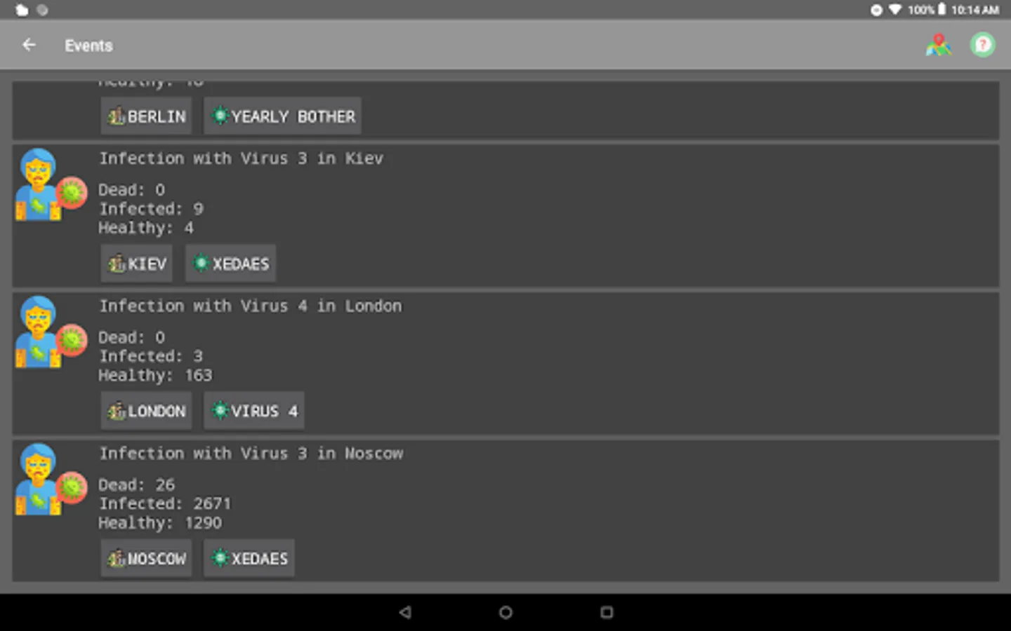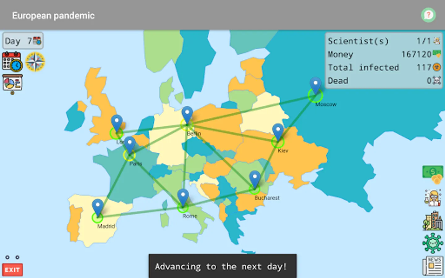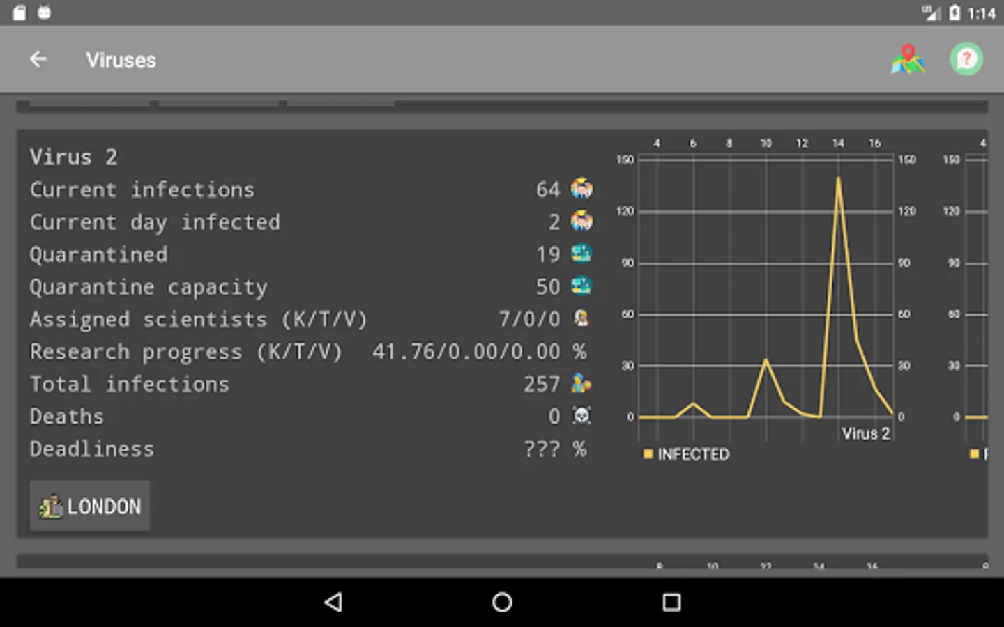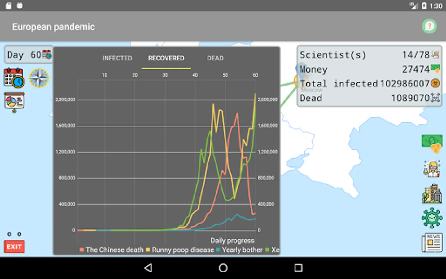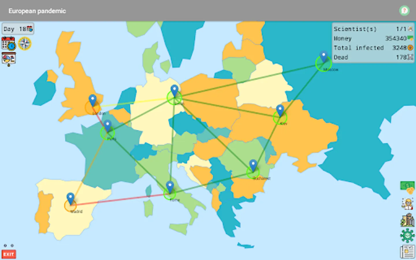 Suddenly viruses break out in different cities. You are in charge. Hire scientists. Control the different categories of research. Order quarantines and lockdowns. Figure out which virus is the real threat.