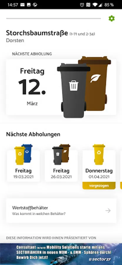 Do you often stand in front of the waste bins and wonder which bin will be emptied next? Do you then go by the fill level or rather by the neighbors? We felt the same way and for this reason we developed the garbage calendar app, which shows the next dates for your street and even takes into account special regulations, e.g. for public holidays.