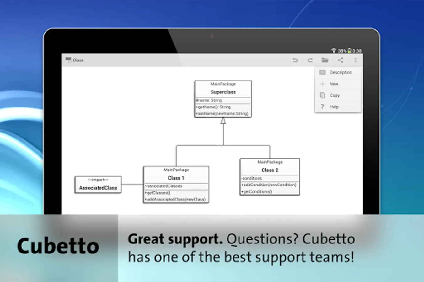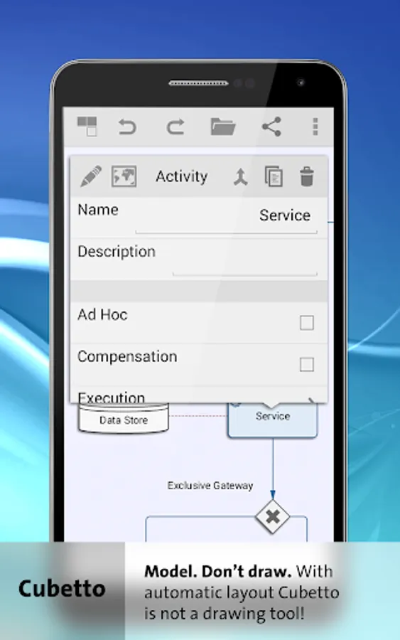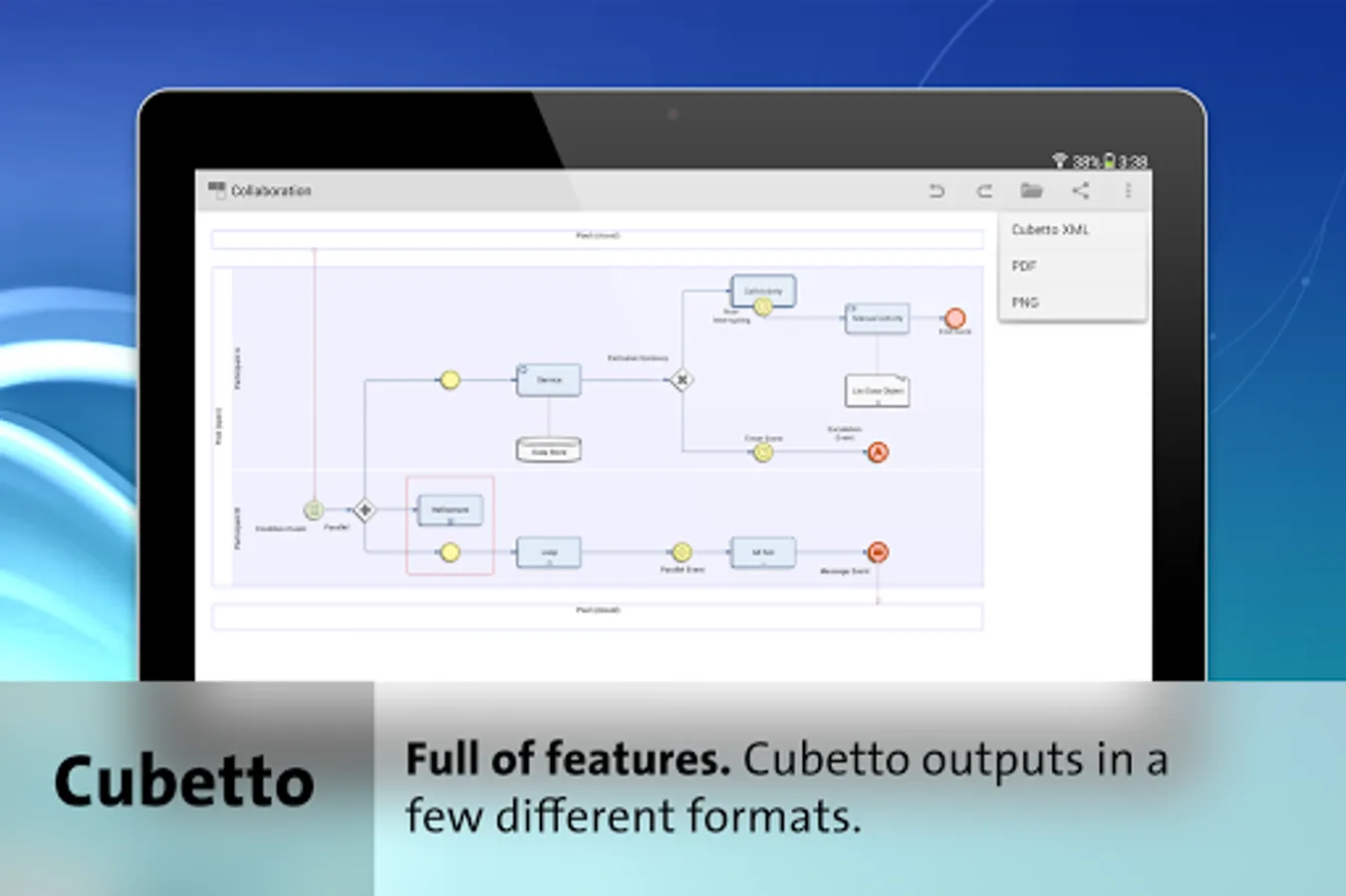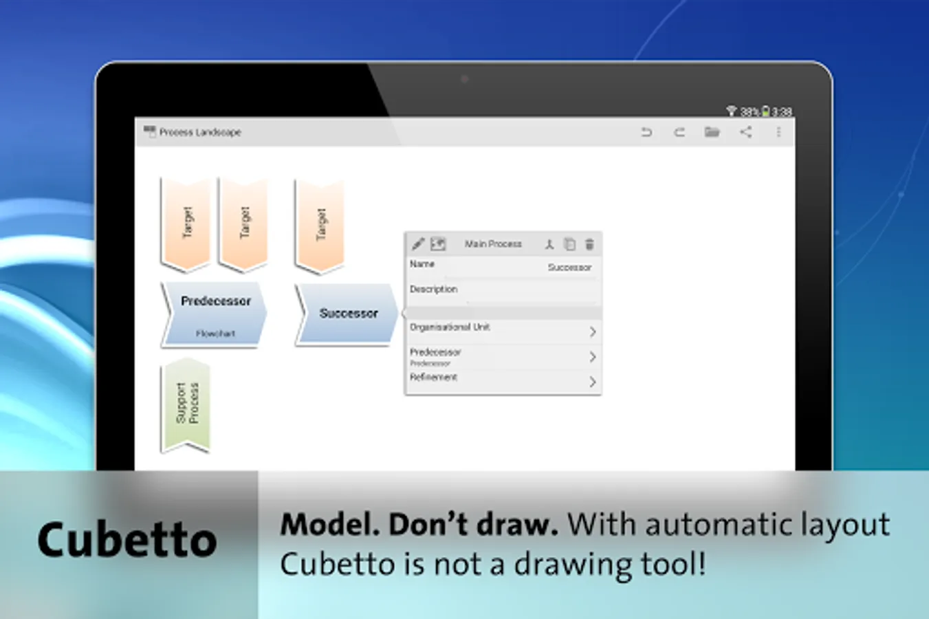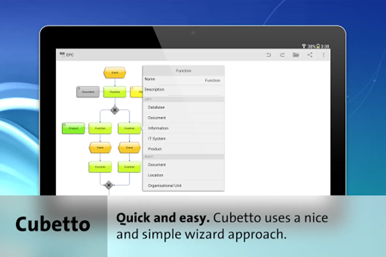 Cubetto is the Swiss army knife for business process modeling and the illustration of organizational structures. The app combines leading modeling standards in one tool: BPMN, Event-driven Process Chains (EPC) known from the Architecture of Integrated Information Systems (ARIS), process landscapes, organizational charts, mind maps, Unified Modeling Language (UML) and flow charts. Additionally it comes with the diagram "Nodes and Edges", a template based presentation form with free graphical definition.