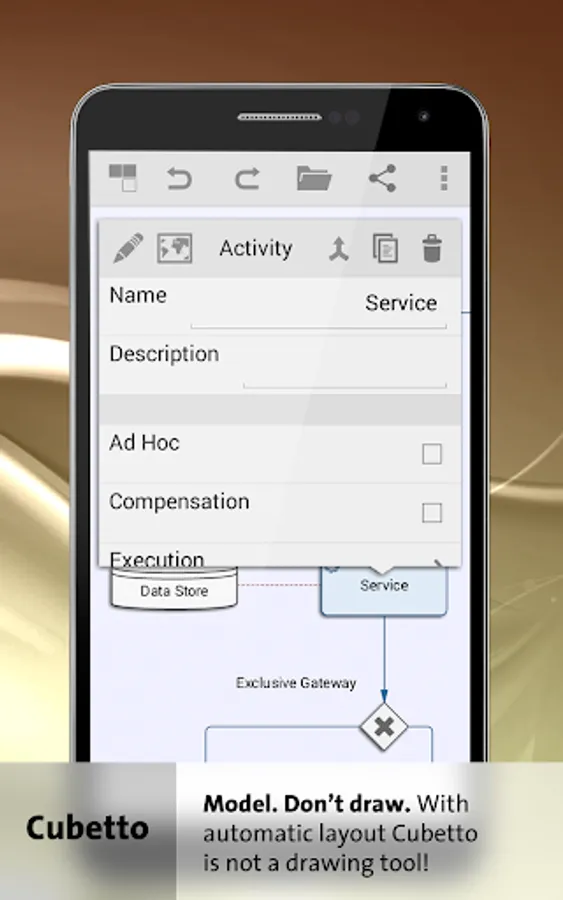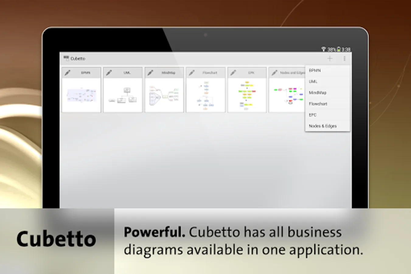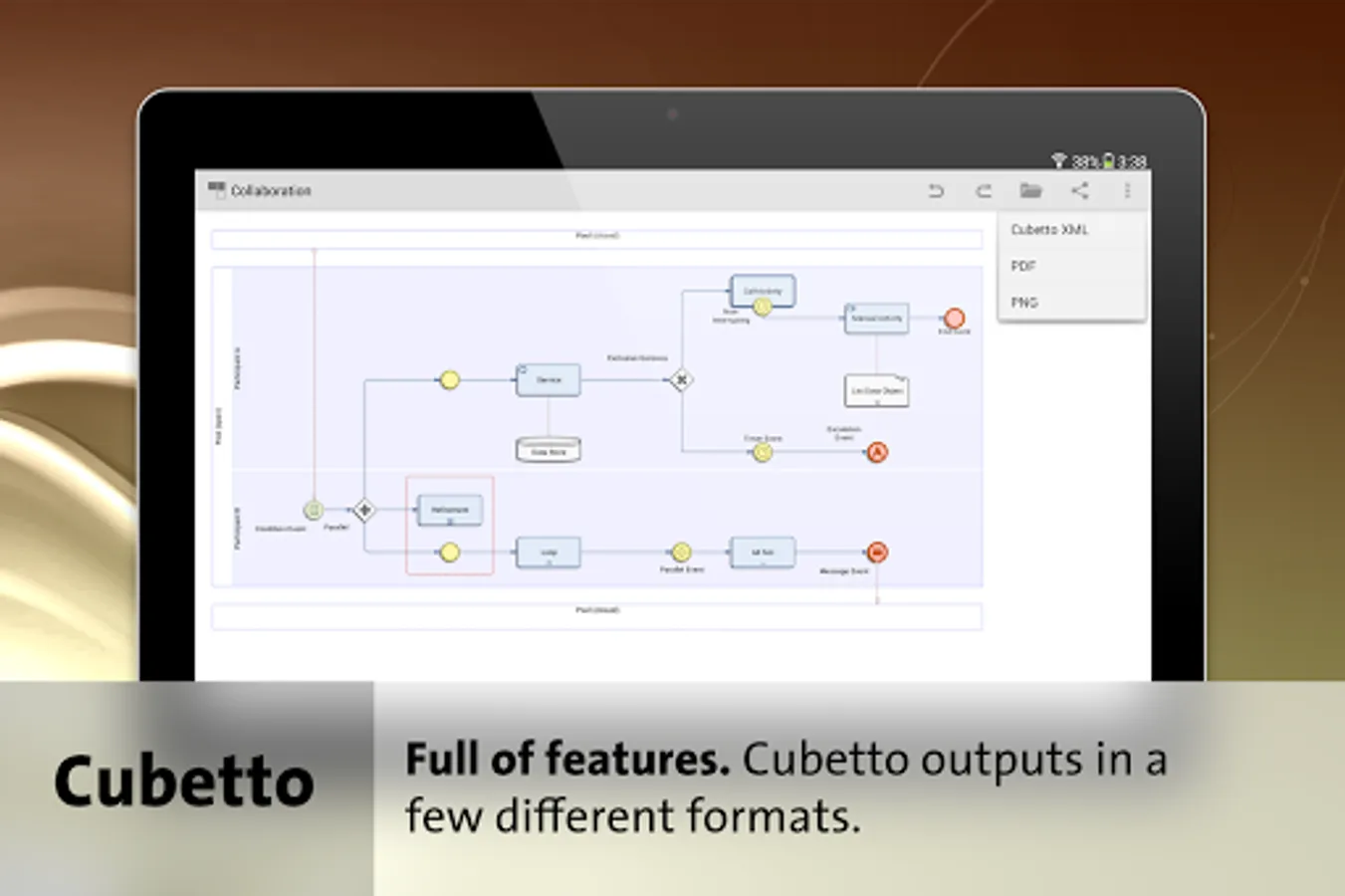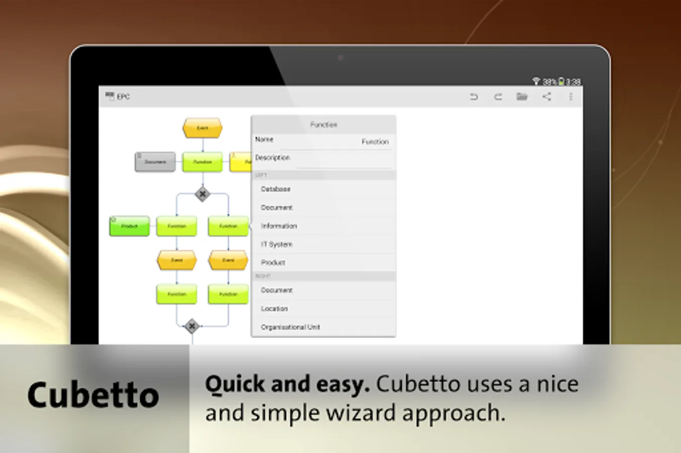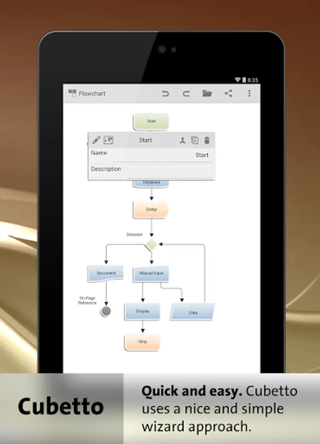 Cubetto is the Swiss army knife for business process modeling and the illustration of organizational structures. The app combines leading modeling standards in one tool: BPMN, Value Stream Maps known from Lean Management, Event-driven Process Chains (EPC) known from the Architecture of Integrated Information Systems (ARIS), process landscapes, organizational charts, mind maps, Unified Modeling Language (UML) and flow charts. Additionally it comes with the diagram "Nodes and Edges", a template based presentation form with free graphical definition.
