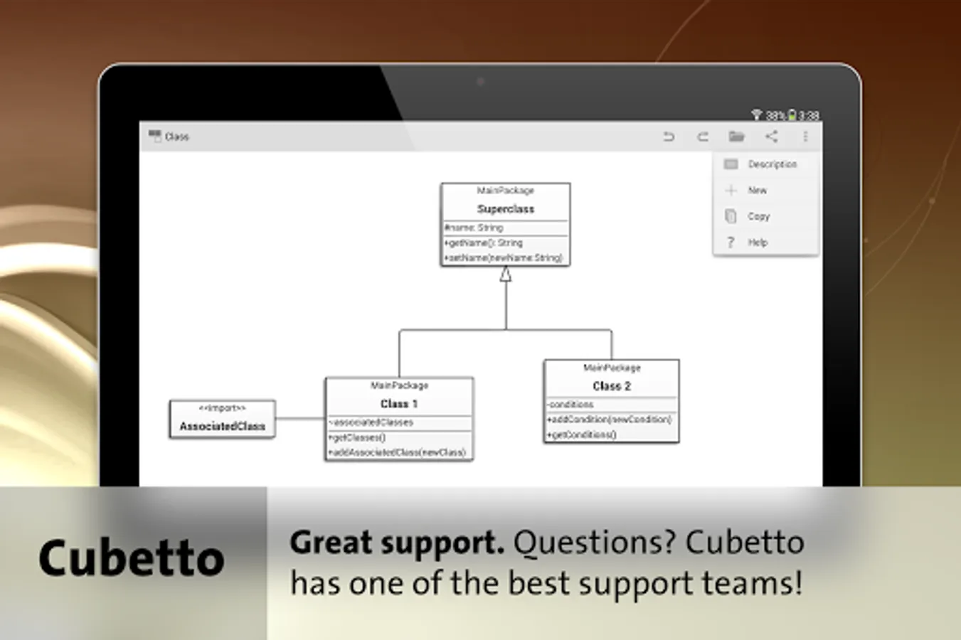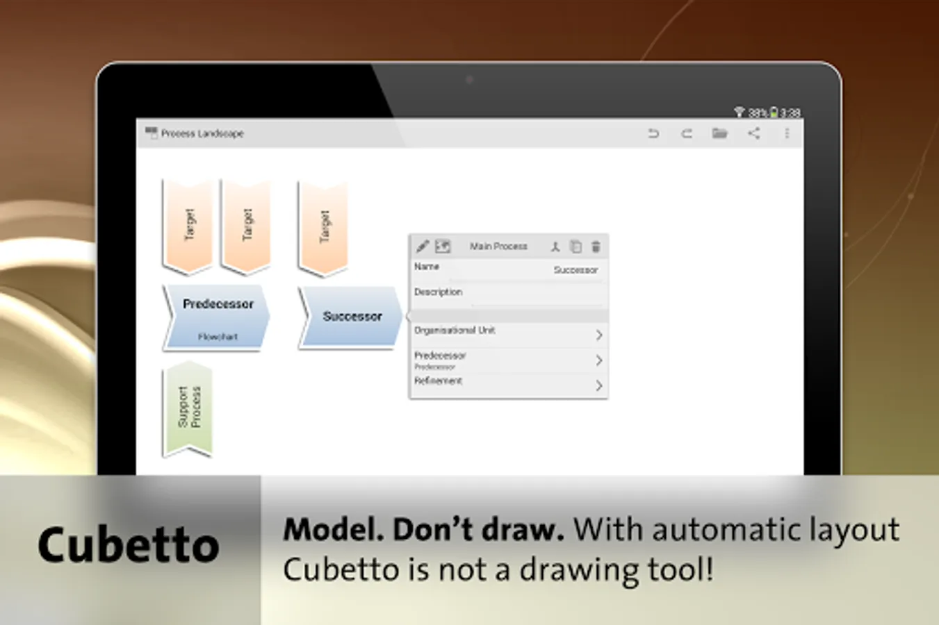 Unrivaled and exceptional is the the consequent use of automated layout within Cubetto. You focus on the contents, the app on their presentation. Our Process-Flow-Wizard allows you to gather procedures in a speed you do not want to miss anymore. Cubetto is an excellent tool for workshops and meetings, either via Screen Mirroring.