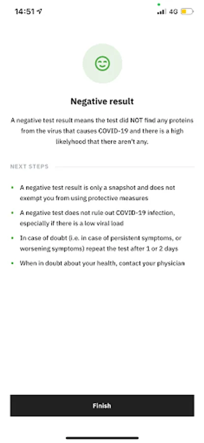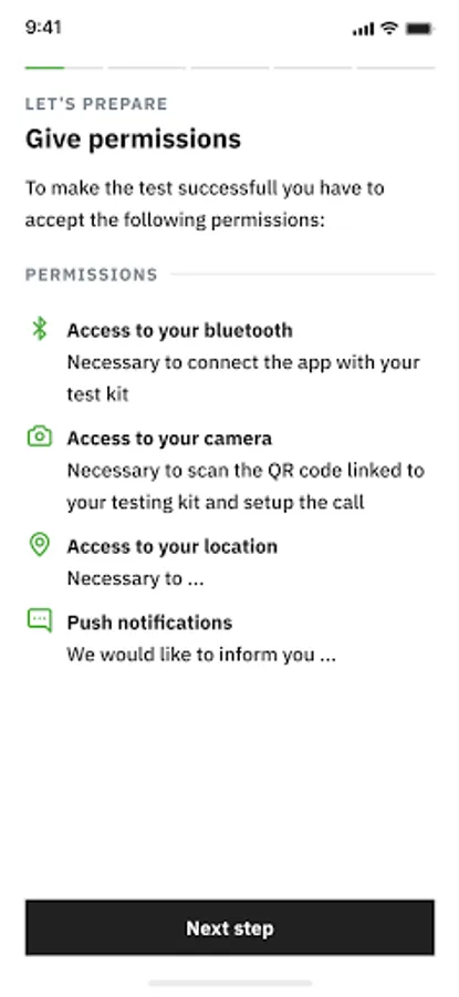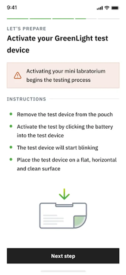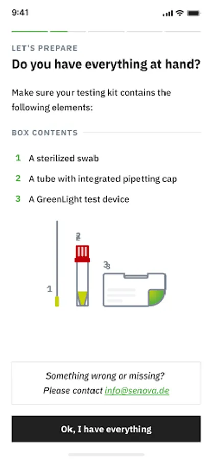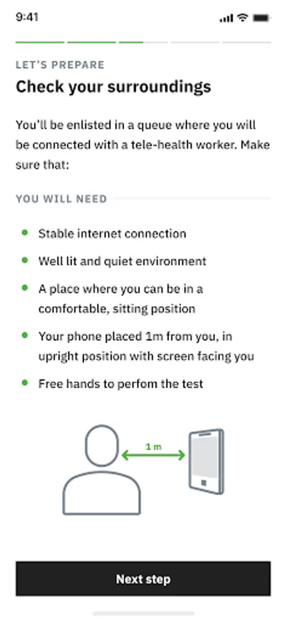 The MyGreenLight application is designed and approved to provide a guided and supervised home test solution. Users are required to obtain the corresponding hardware device and will be connected in the application via videochat to a tele-health organisation. During this remote supervision, the user is navigated to conduct a test correctly. After the test process is completed, a test result is obtained in the app.