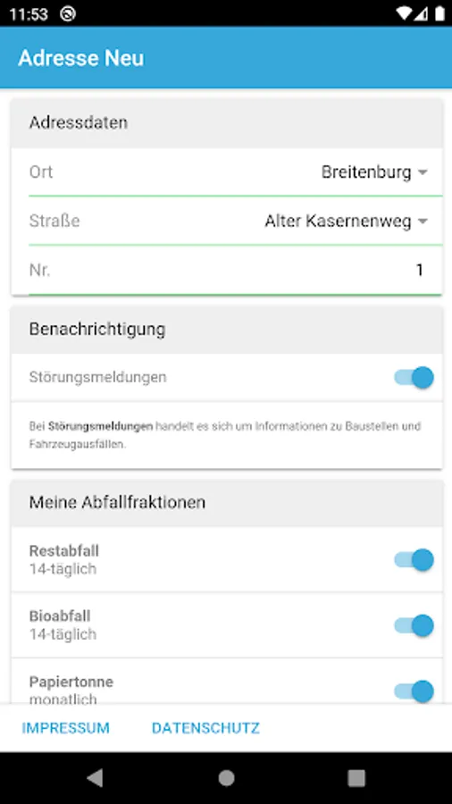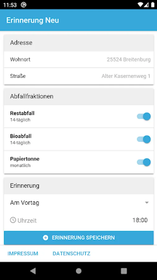 Enter your address and select the types of waste that you would like to be reminded of. In addition, you can set the reminder time so that you never miss a collection day.