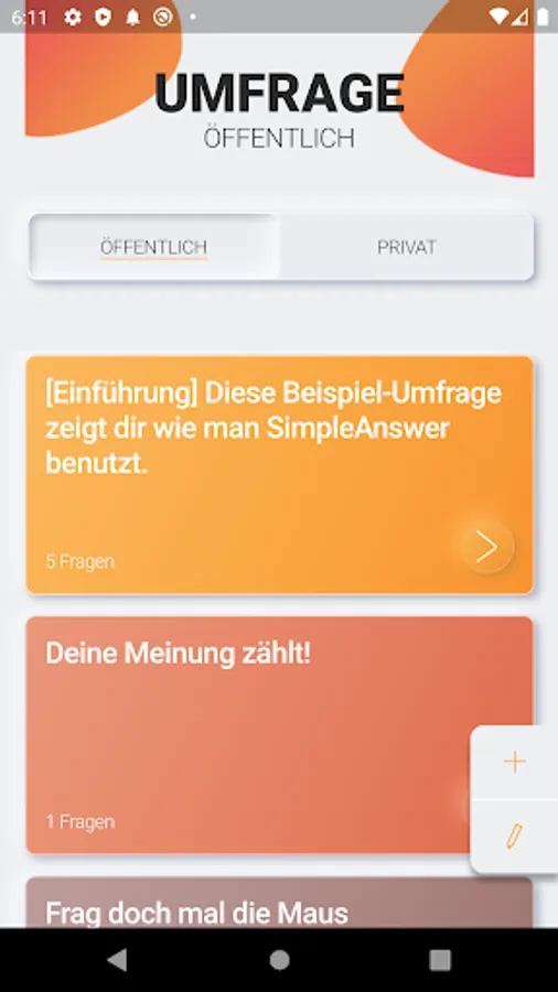 Create your own surveys now or answer public and shared surveys in the SimpleAnswer app.