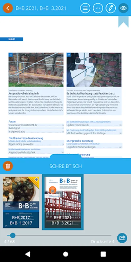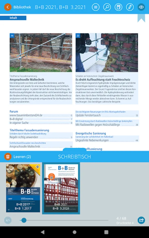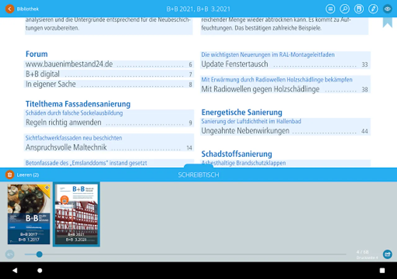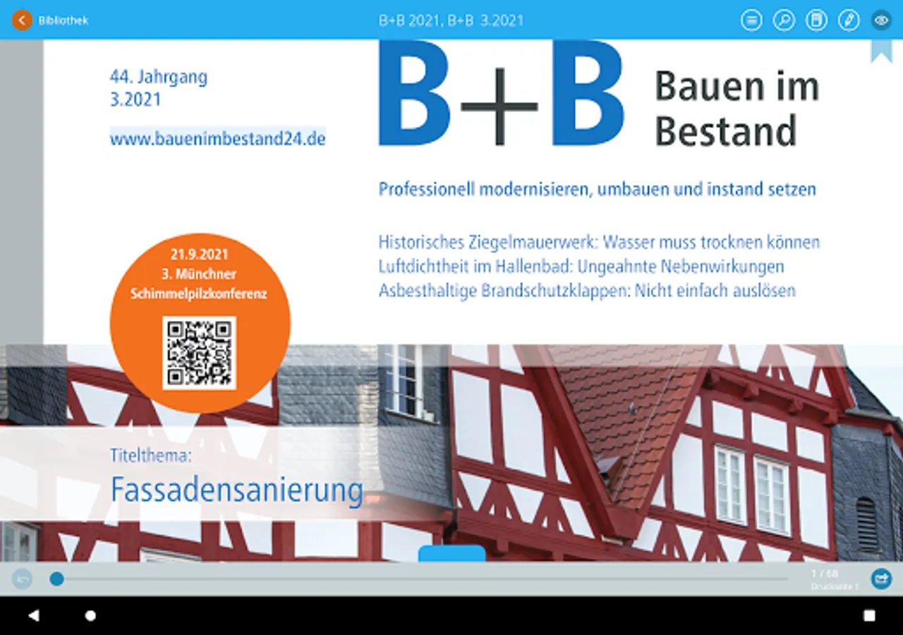 B + B Bauen imStock offers structural (specialist) planners, building experts and executives in executing companies with a focus on the renovation of old buildings, technical information on professional repair, modernization and conversion and focuses primarily on building construction. The main topics are building maintenance, building sealing, building protection, masonry renovation, concrete repair, half-timbering repair, facade renovation with window replacement and repair, (fighting) wood protection, fire protection, interior renovation, monument preservation, accessibility in existing buildings, building heights, energetic renovation (especially: exterior and interior insulation, air tightness, Plant engineering such as generation of renewable energies, application of the building energy law for energetic modernization), pollution control, mold remediation, indoor air and hygiene. The aim is to map the entire process for building work in existing buildings, from building condition assessment and building diagnostics to structural planning to execution and coordination of the trades. Information on new products, systems, processes and tools, occupational safety as well as interesting specialist media and events round off the range of information.