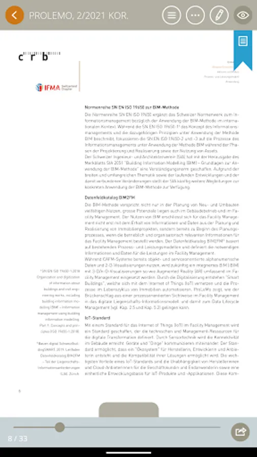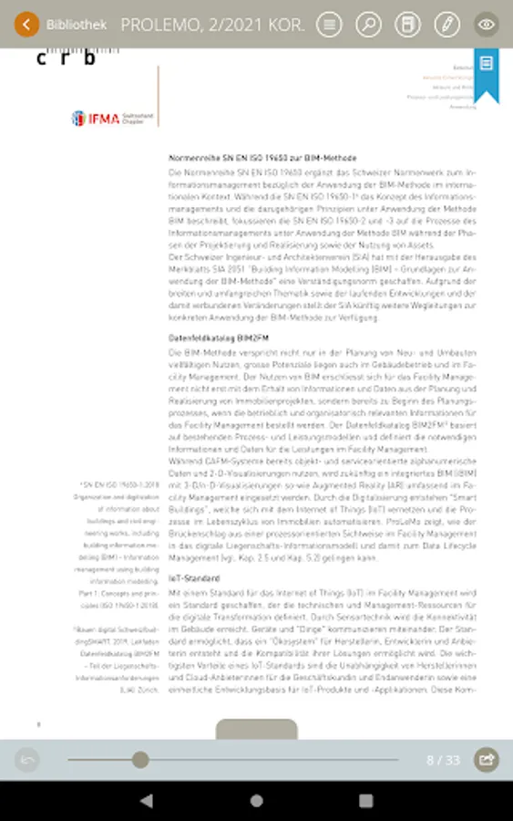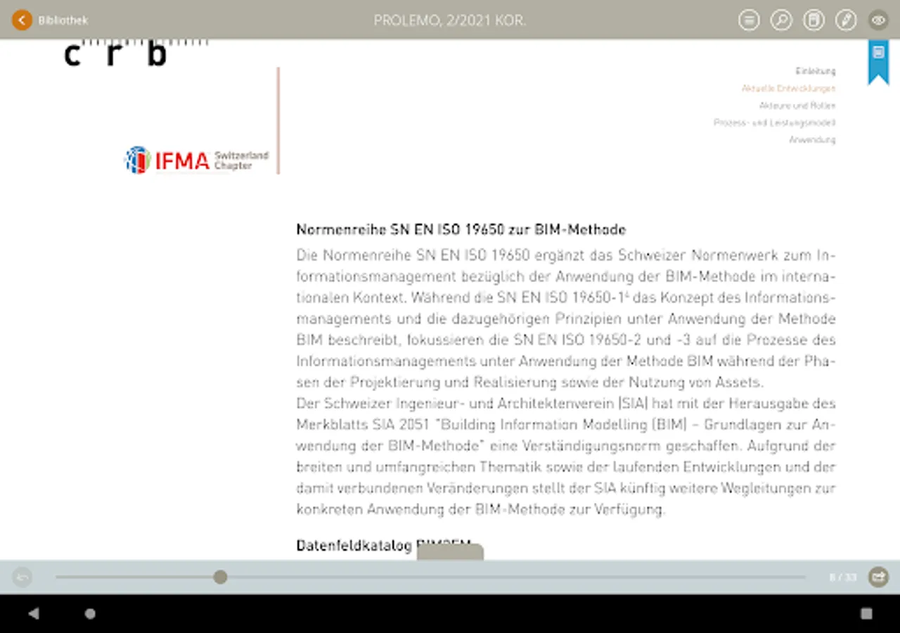 CRB-eBooks is a reading app that allows selected standard CRB documents and tools to be viewed as e-books. These e-books combine the benefits of a printed publication with the possibilities offered by digital applications. In other words, the e-books are accessible at all times from any location via smartphone, tablet, or PC browser while offering high contemporary user comfort through efficient search functions and provision for storing notes, links, pictures and moving images.