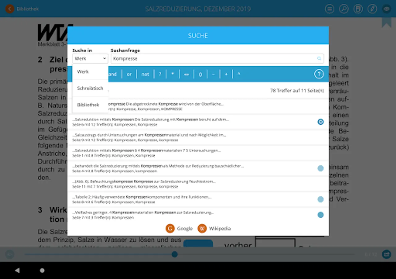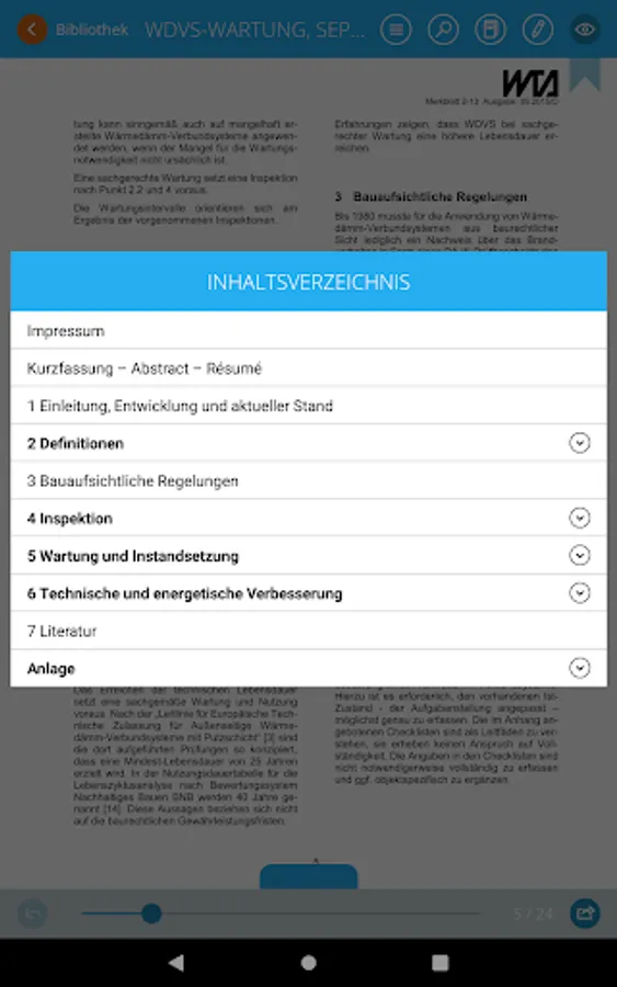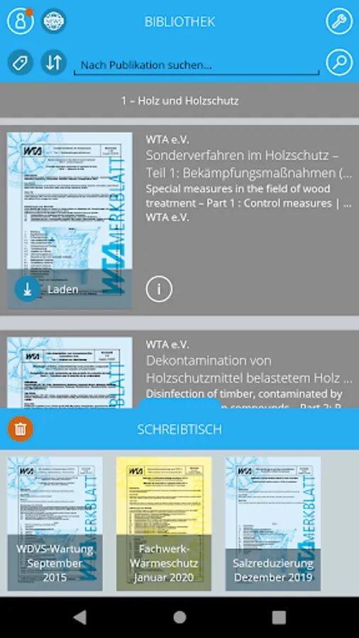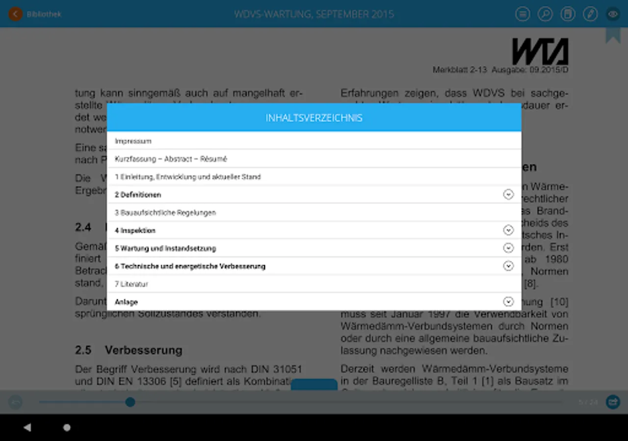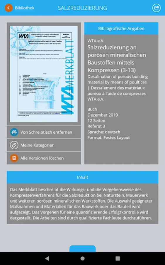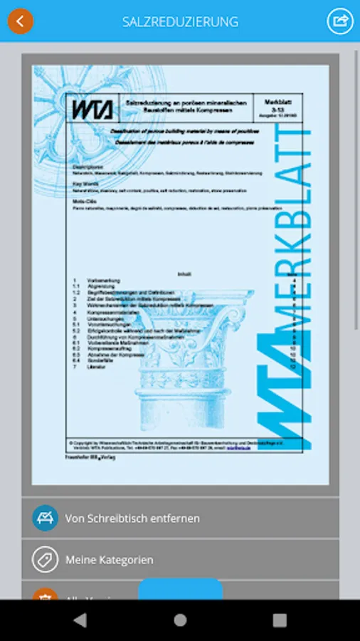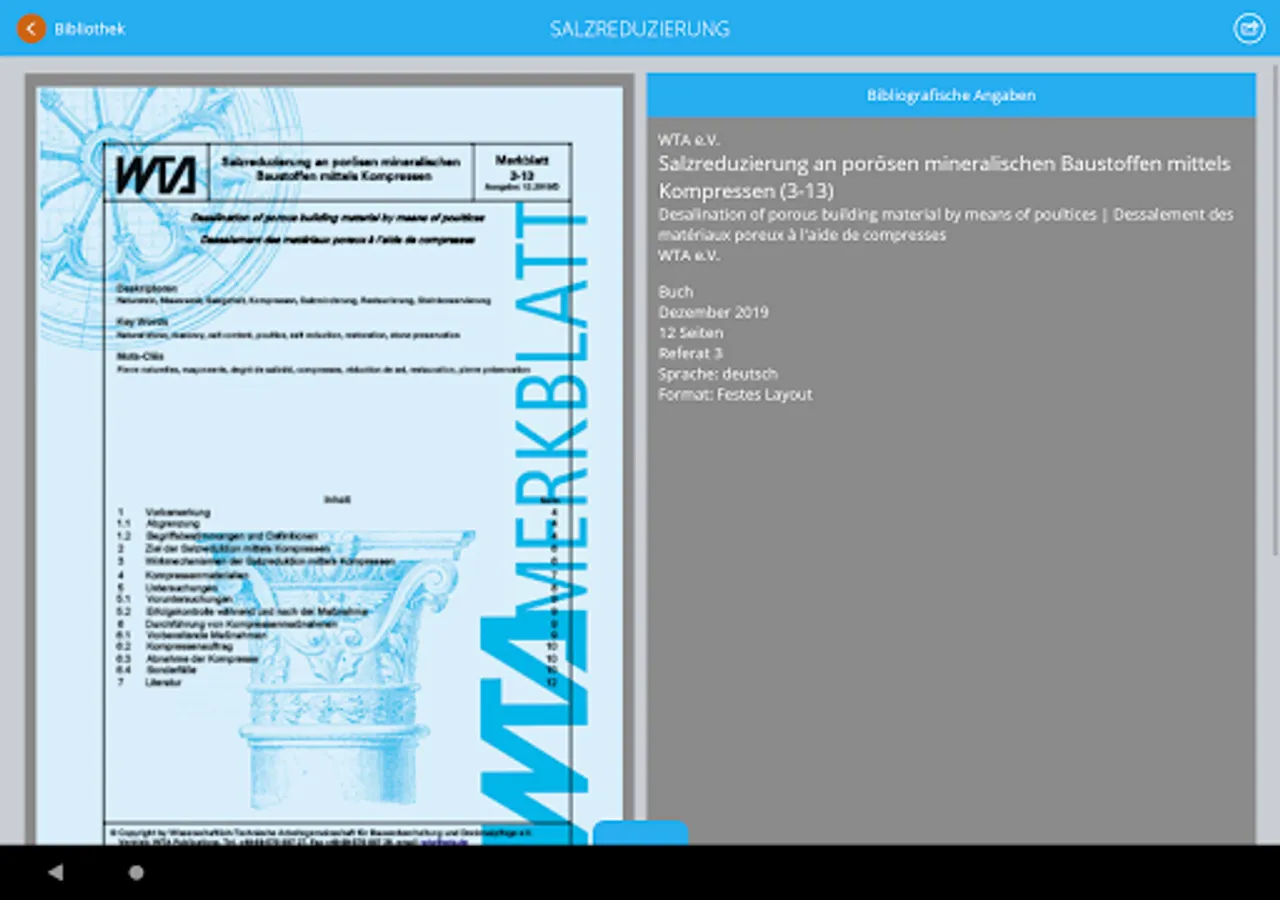 The App »WTA-Recommendations« contains all applicable recommendations of the International Association for Science and Technology of Building Maintenance and Monuments Preservation, (WTA). The WTA-Recommendations explain very practically-oriented the building rehabilitation process and the refurbishment of historic structures.