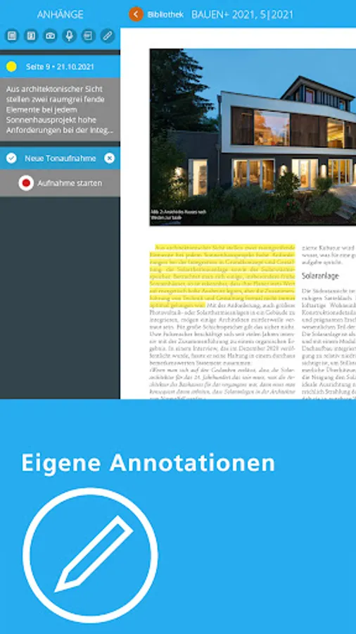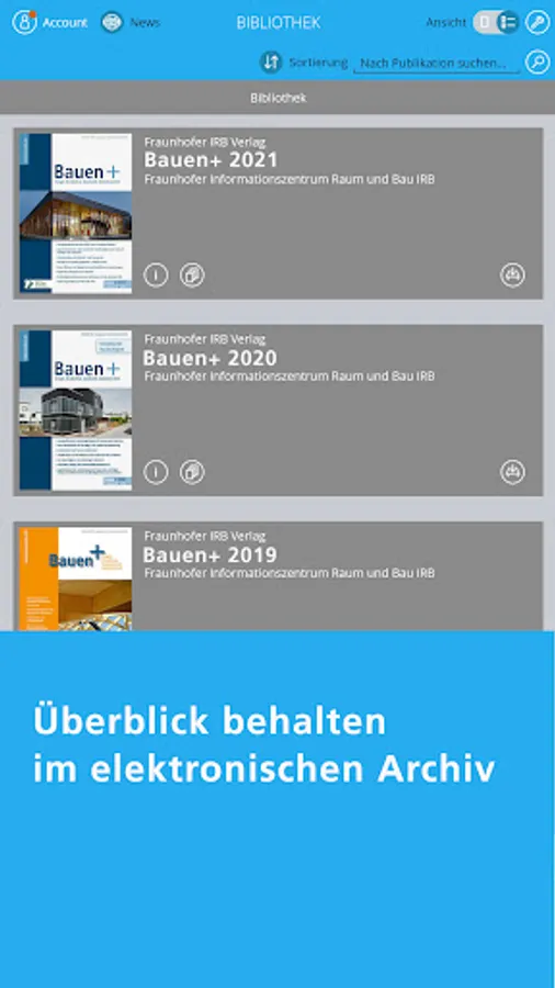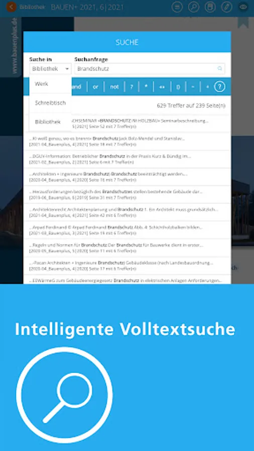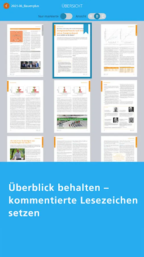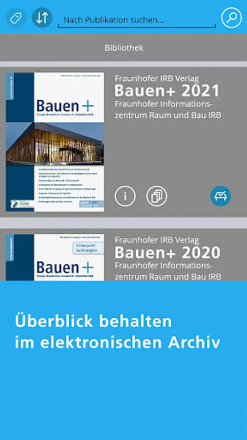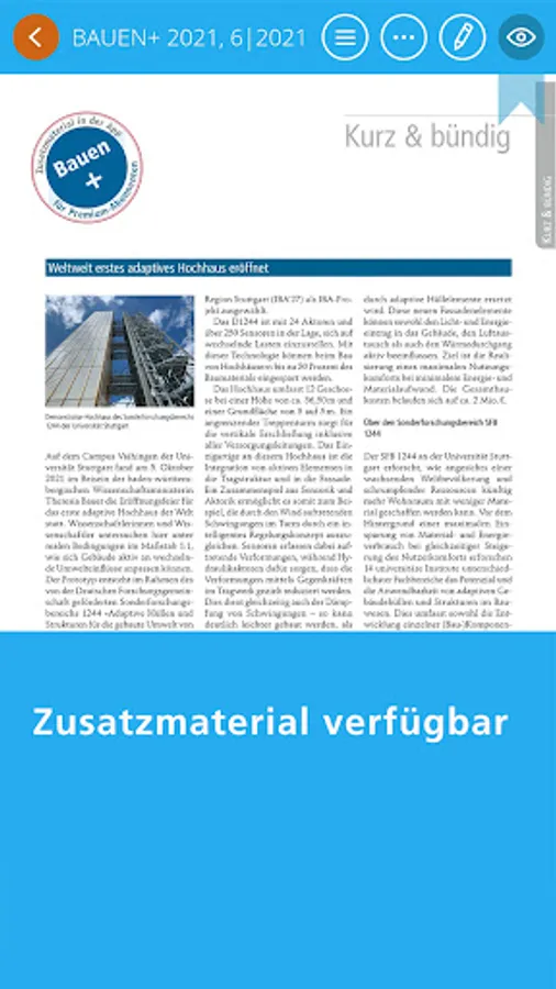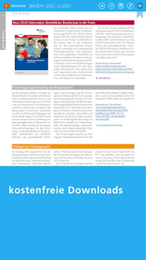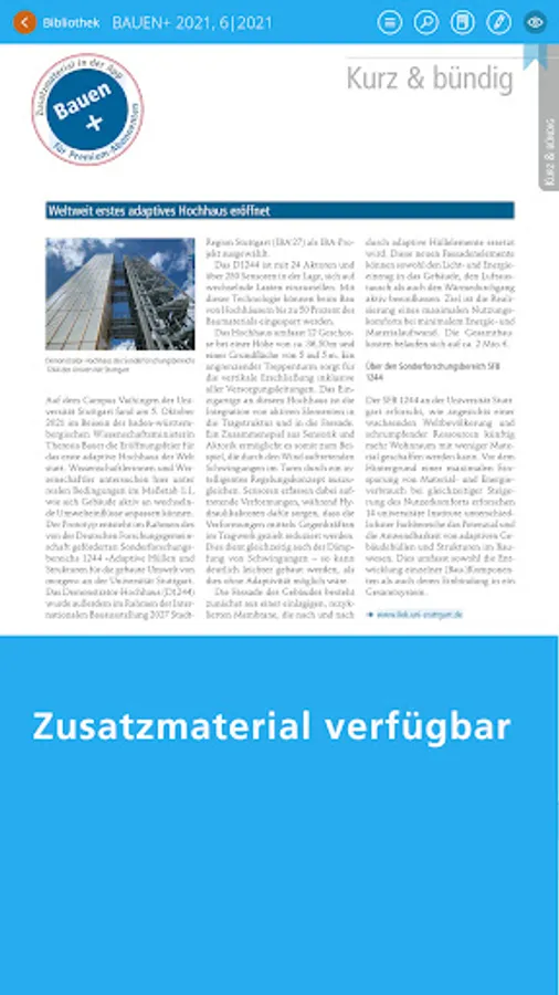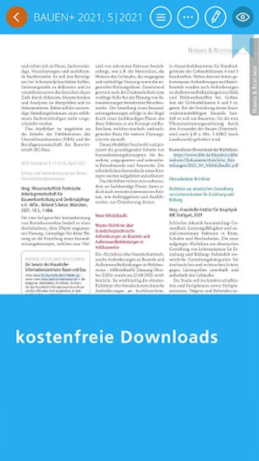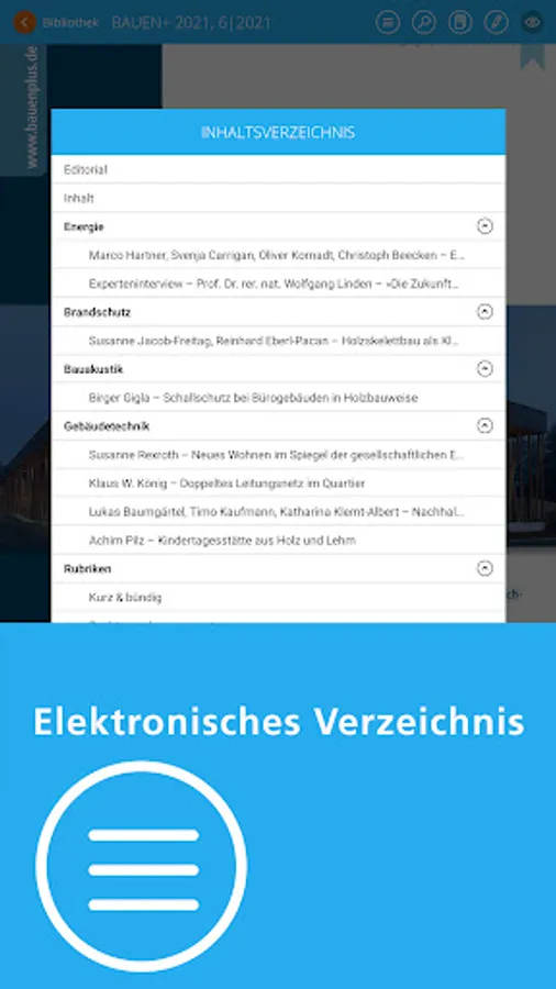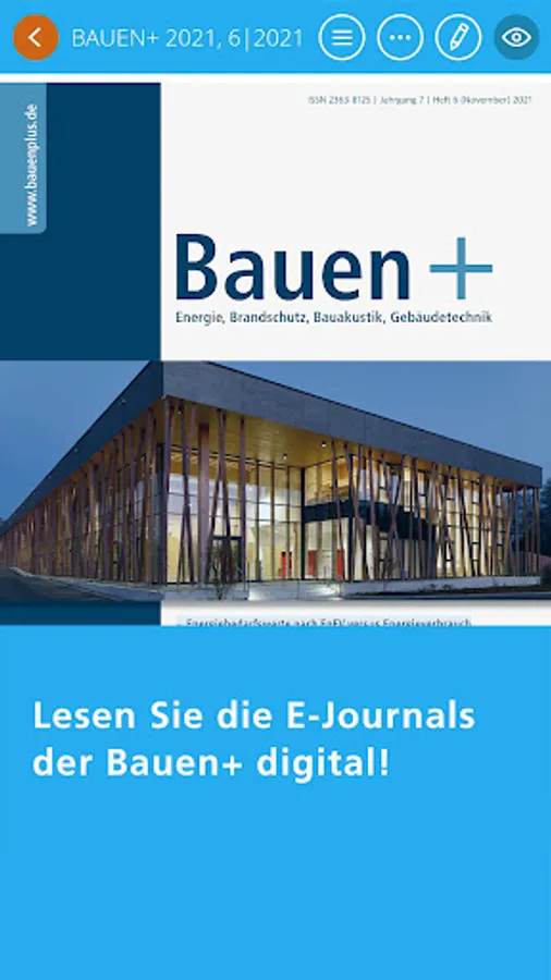 The eJournal is available earlier than the printed edition and contains additional information, such as picture series. With the preparation of Bauen+ for the app you keep track of the electronic table of contents and with the fast search function you can find your way around the documents without much effort.
